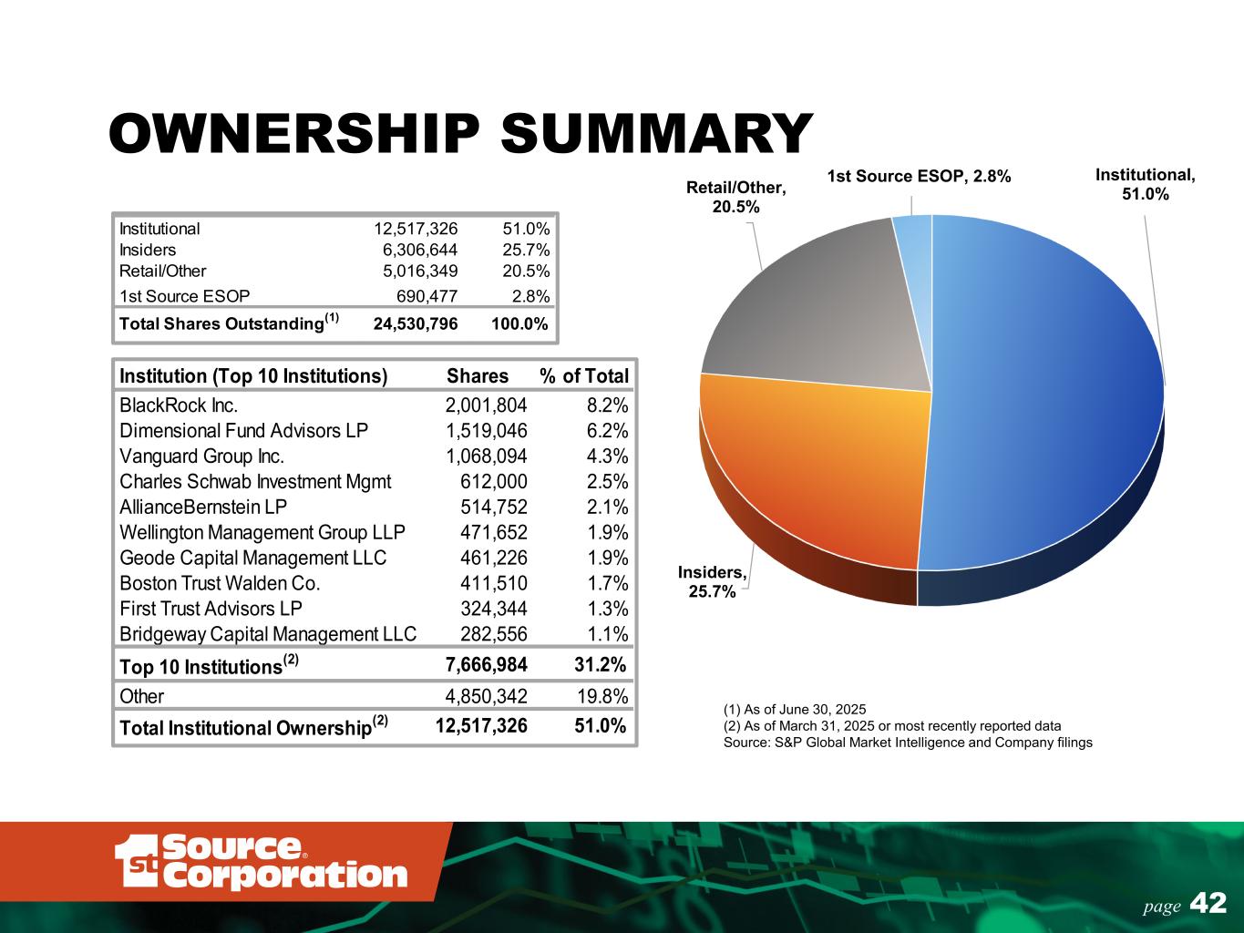 42page OWNERSHIP SUMMARY Institution (Top 10 Institutions) Shares % of Total BlackRock Inc. 2,001,804 8.2% Dimensional Fund Advisors LP 1,519,046 6.2% Vanguard Group Inc. 1,068,094 4.3% Charles Schwab Investment Mgmt 612,000 2.5% AllianceBernstein LP 514,752 2.1% Wellington Management Group LLP 471,652 1.9% Geode Capital Management LLC 461,226 1.9% Boston Trust Walden Co. 411,510 1.7% First Trust Advisors LP 324,344 1.3% Bridgeway Capital Management LLC 282,556 1.1% Top 10 Institutions(2) 7,666,984 31.2% Other 4,850,342 19.8% Total Institutional Ownership(2) 12,517,326 51.0% Institutional, 51.0% Insiders, 25.7% Retail/Other, 20.5% 1st Source ESOP, 2.8% (1) As of June 30, 2025 (2) As of March 31, 2025 or most recently reported data Source: S&P Global Market Intelligence and Company filings Institutional 12,517,326 51.0% Insiders 6,306,644 25.7% Retail/Other 5,016,349 20.5% 1st Source ESOP 690,477 2.8% Total Shares Outstanding(1) 24,530,796 100.0%