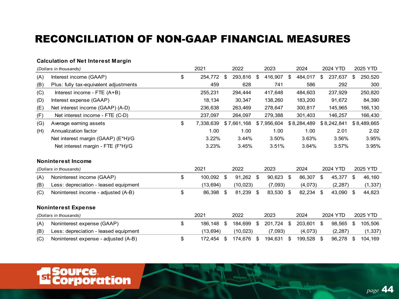 44page RECONCILIATION OF NON-GAAP FINANCIAL MEASURES Calculation of Net Interest Margin (Dollars in thousands) 2021 2022 2023 2024 2024 YTD 2025 YTD (A) Interest income (GAAP) 254,772$ 293,816$ 416,907$ 484,017$ 237,637$ 250,520$ (B) Plus: fully tax-equivalent adjustments 459 628 741 586 292 300 (C) Interest income - FTE (A+B) 255,231 294,444 417,648 484,603 237,929 250,820 (D) Interest expense (GAAP) 18,134 30,347 138,260 183,200 91,672 84,390 (E) Net interest income (GAAP) (A-D) 236,638 263,469 278,647 300,817 145,965 166,130 (F) Net interest income - FTE (C-D) 237,097 264,097 279,388 301,403 146,257 166,430 (G) Average earning assets 7,338,639$ 7,661,168$ 7,956,604$ 8,284,489$ 8,242,841$ 8,489,665$ (H) Annualization factor 1.00 1.00 1.00 1.00 2.01 2.02 Net interest margin (GAAP) (E*H)/G 3.22% 3.44% 3.50% 3.63% 3.56% 3.95% Net interest margin - FTE (F*H)/G 3.23% 3.45% 3.51% 3.64% 3.57% 3.95% Noninterest Income (Dollars in thousands) 2021 2022 2023 2024 2024 YTD 2025 YTD (A) Noninterest income (GAAP) 100,092$ 91,262$ 90,623$ 86,307$ 45,377$ 46,160$ (B) Less: depreciation - leased equipment (13,694) (10,023) (7,093) (4,073) (2,287) (1,337) (C) Noninterest income - adjusted (A-B) 86,398$ 81,239$ 83,530$ 82,234$ 43,090$ 44,823$ Noninterest Expense (Dollars in thousands) 2021 2022 2023 2024 2024 YTD 2025 YTD (A) Noninterest expense (GAAP) 186,148$ 184,699$ 201,724$ 203,601$ 98,565$ 105,506$ (B) Less: depreciation - leased equipment (13,694) (10,023) (7,093) (4,073) (2,287) (1,337) (C) Noninterest expense - adjusted (A-B) 172,454$ 174,676$ 194,631$ 199,528$ 96,278$ 104,169$