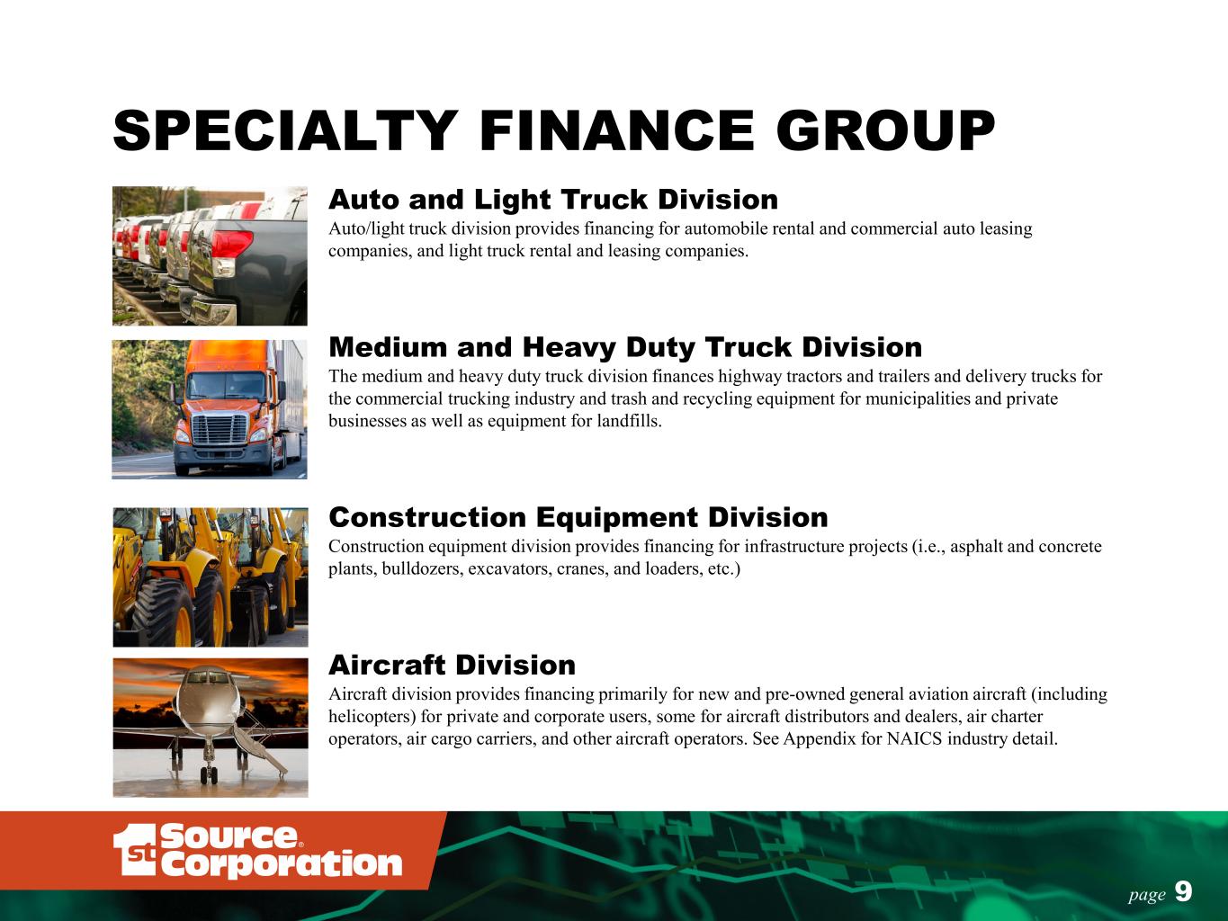 SPECIALTY FINANCE GROUP Auto and Light Truck Division Auto/light truck division provides financing for automobile rental and commercial auto leasing companies, and light truck rental and leasing companies. Medium and Heavy Duty Truck Division The medium and heavy duty truck division finances highway tractors and trailers and delivery trucks for the commercial trucking industry and trash and recycling equipment for municipalities and private businesses as well as equipment for landfills. Construction Equipment Division Construction equipment division provides financing for infrastructure projects (i.e., asphalt and concrete plants, bulldozers, excavators, cranes, and loaders, etc.) Aircraft Division Aircraft division provides financing primarily for new and pre-owned general aviation aircraft (including helicopters) for private and corporate users, some for aircraft distributors and dealers, air charter operators, air cargo carriers, and other aircraft operators. See Appendix for NAICS industry detail. 9page
