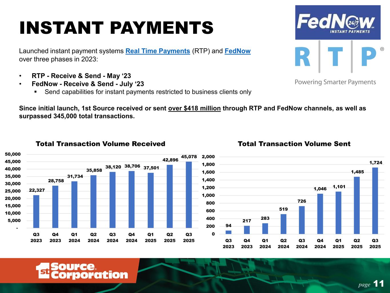 page 11 INSTANT PAYMENTS Launched instant payment systems Real Time Payments (RTP) and FedNow over three phases in 2023: • RTP - Receive & Send - May ‘23 • FedNow - Receive & Send - July ‘23 Send capabilities for instant payments restricted to business clients only Since initial launch, 1st Source received or sent over $418 million through RTP and FedNow channels, as well as surpassed 345,000 total transactions. 94 217 283 519 726 1,046 1,101 1,485 1,724 0 200 400 600 800 1,000 1,200 1,400 1,600 1,800 2,000 Q3 2023 Q4 2023 Q1 2024 Q2 2024 Q3 2024 Q4 2024 Q1 2025 Q2 2025 Q3 2025 Total Transaction Volume Sent 22,327 28,758 31,734 35,858 38,120 38,706 37,501 42,896 45,078 - 5,000 10,000 15,000 20,000 25,000 30,000 35,000 40,000 45,000 50,000 Q3 2023 Q4 2023 Q1 2024 Q2 2024 Q3 2024 Q4 2024 Q1 2025 Q2 2025 Q3 2025 Total Transaction Volume Received