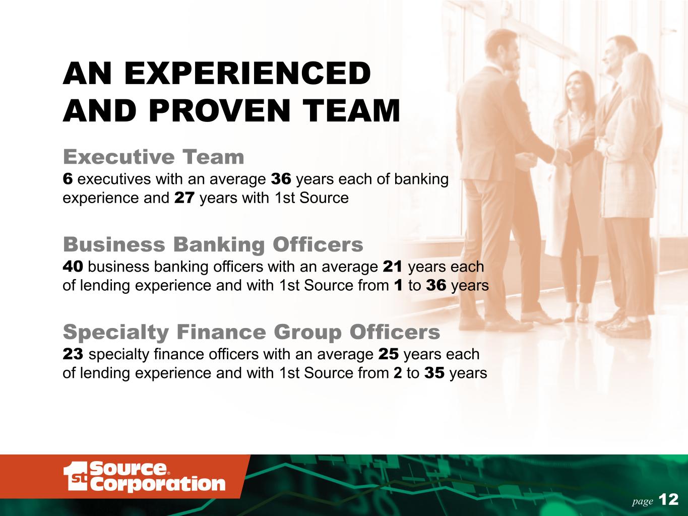 AN EXPERIENCED AND PROVEN TEAM Executive Team 6 executives with an average 36 years each of banking experience and 27 years with 1st Source Business Banking Officers 40 business banking officers with an average 21 years each of lending experience and with 1st Source from 1 to 36 years Specialty Finance Group Officers 23 specialty finance officers with an average 25 years each of lending experience and with 1st Source from 2 to 35 years 12page