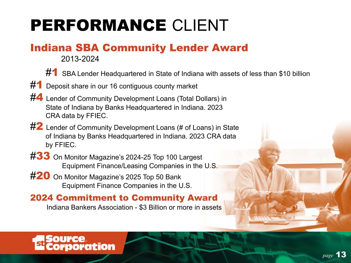 PERFORMANCE CLIENT Indiana SBA Community Lender Award 2013-2024 #1 SBA Lender Headquartered in State of Indiana with assets of less than $10 billion #1 Deposit share in our 16 contiguous county market #4 Lender of Community Development Loans (Total Dollars) in State of Indiana by Banks Headquartered in Indiana. 2023 CRA data by FFIEC. #2 Lender of Community Development Loans (# of Loans) in State of Indiana by Banks Headquartered in Indiana. 2023 CRA data by FFIEC. #33 On Monitor Magazine’s 2024-25 Top 100 Largest Equipment Finance/Leasing Companies in the U.S. #20 On Monitor Magazine’s 2025 Top 50 Bank Equipment Finance Companies in the U.S. 2024 Commitment to Community Award Indiana Bankers Association - $3 Billion or more in assets 13page