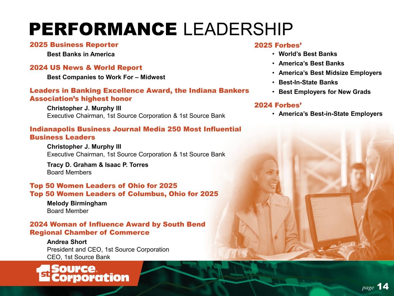 14page PERFORMANCE LEADERSHIP 2025 Business Reporter Best Banks in America 2024 US News & World Report Best Companies to Work For – Midwest Leaders in Banking Excellence Award, the Indiana Bankers Association’s highest honor Christopher J. Murphy III Executive Chairman, 1st Source Corporation & 1st Source Bank Indianapolis Business Journal Media 250 Most Influential Business Leaders Christopher J. Murphy III Executive Chairman, 1st Source Corporation & 1st Source Bank Tracy D. Graham & Isaac P. Torres Board Members Top 50 Women Leaders of Ohio for 2025 Top 50 Women Leaders of Columbus, Ohio for 2025 Melody Birmingham Board Member 2024 Woman of Influence Award by South Bend Regional Chamber of Commerce Andrea Short President and CEO, 1st Source Corporation CEO, 1st Source Bank 2025 Forbes’ • World’s Best Banks • America’s Best Banks • America’s Best Midsize Employers • Best-In-State Banks • Best Employers for New Grads 2024 Forbes’ • America’s Best-in-State Employers