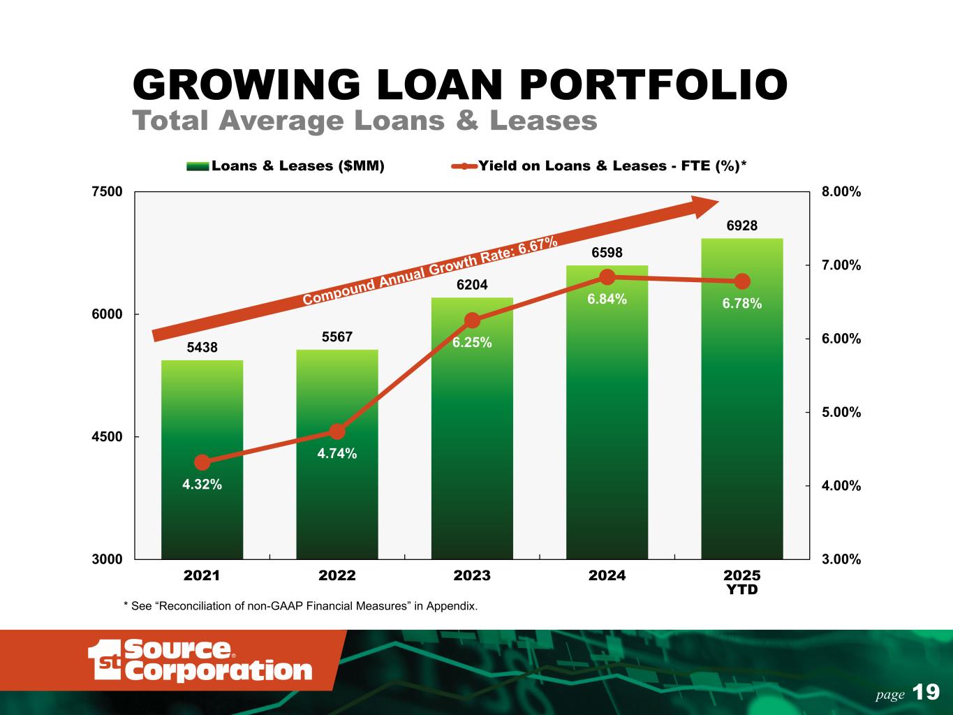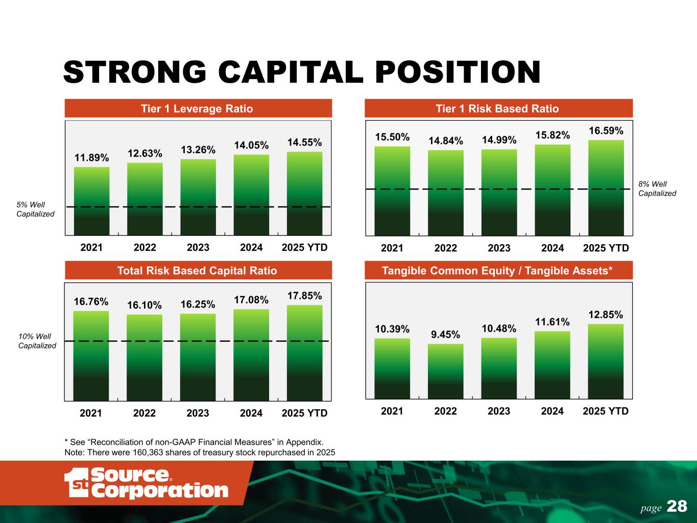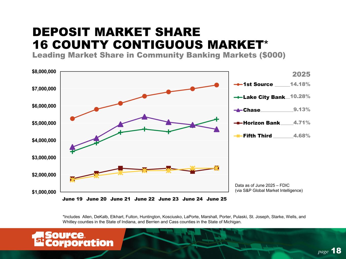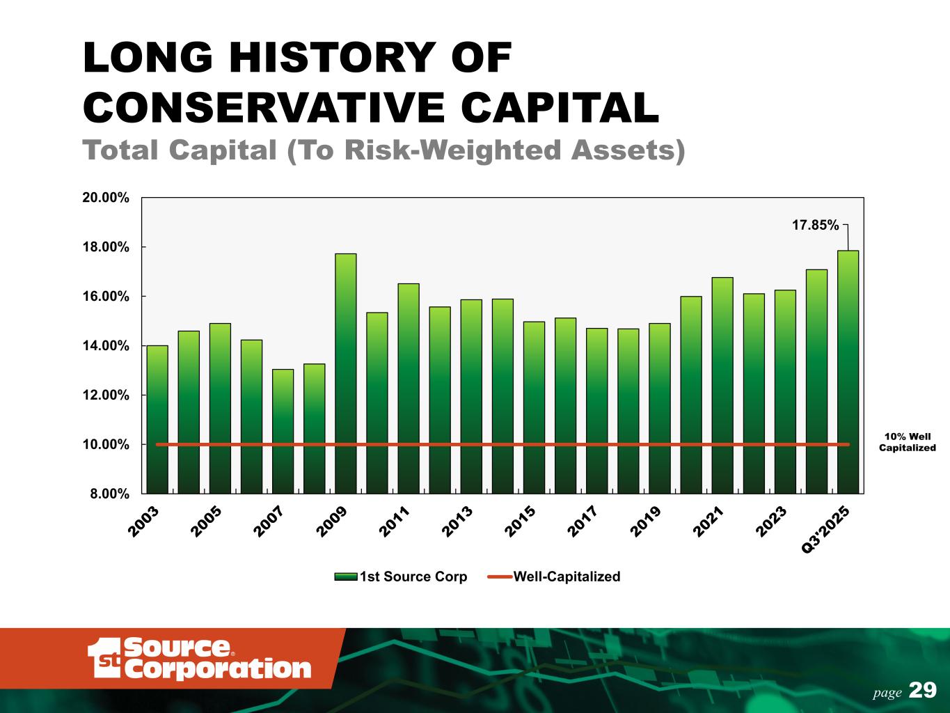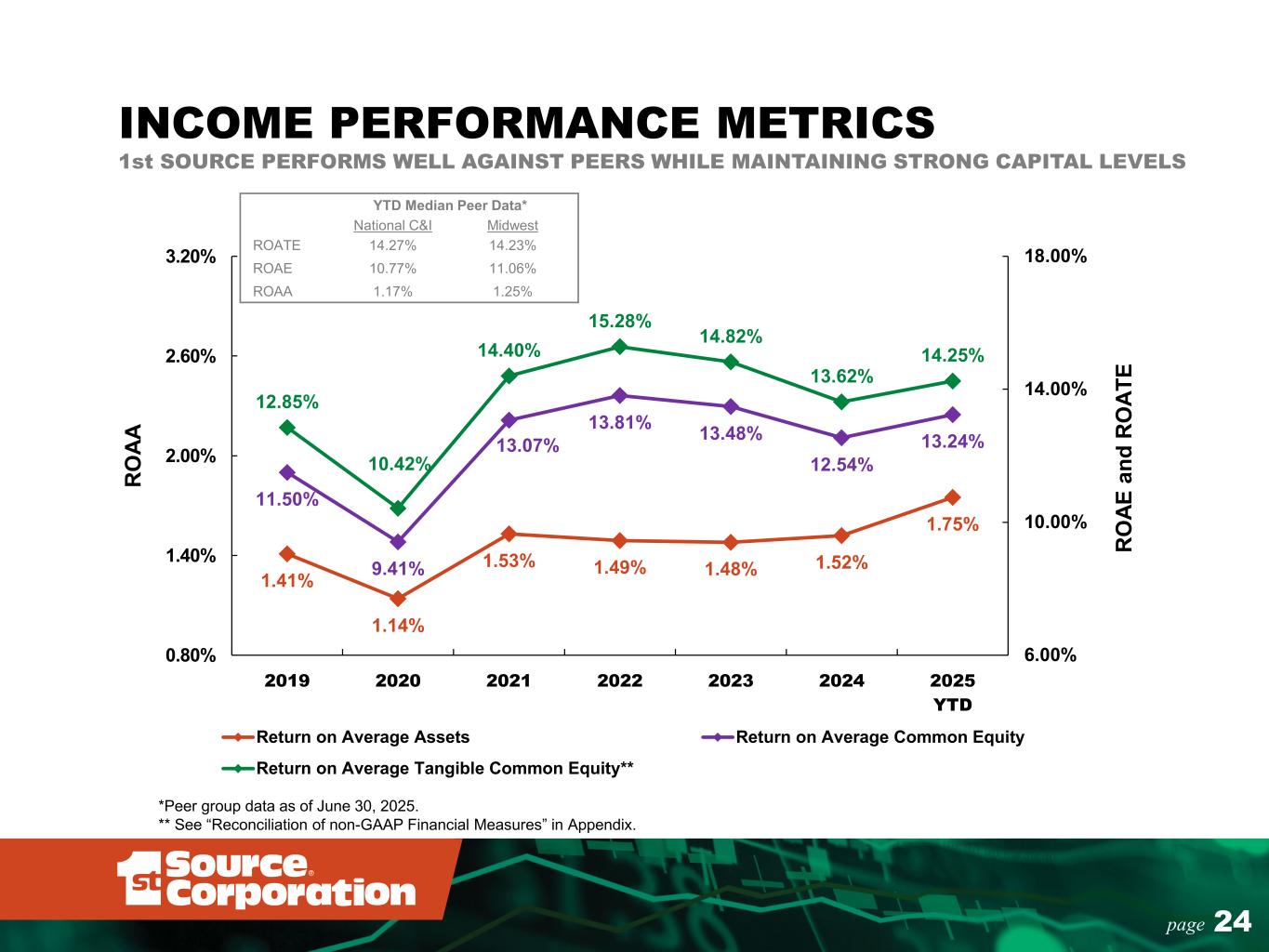 24page 1.41% 1.14% 1.53% 1.49% 1.48% 1.52% 1.75% 11.50% 9.41% 13.07% 13.81% 13.48% 12.54% 13.24% 12.85% 10.42% 14.40% 15.28% 14.82% 13.62% 14.25% 6.00% 10.00% 14.00% 18.00% 0.80% 1.40% 2.00% 2.60% 3.20% 2019 2020 2021 2022 2023 2024 2025 YTD R O AE a nd R O AT E R O AA Return on Average Assets Return on Average Common Equity Return on Average Tangible Common Equity** INCOME PERFORMANCE METRICS 1st SOURCE PERFORMS WELL AGAINST PEERS WHILE MAINTAINING STRONG CAPITAL LEVELS *Peer group data as of June 30, 2025. ** See “Reconciliation of non-GAAP Financial Measures” in Appendix. YTD Median Peer Data* National C&I Midwest ROATE 14.27% 14.23% ROAE 10.77% 11.06% ROAA 1.17% 1.25%