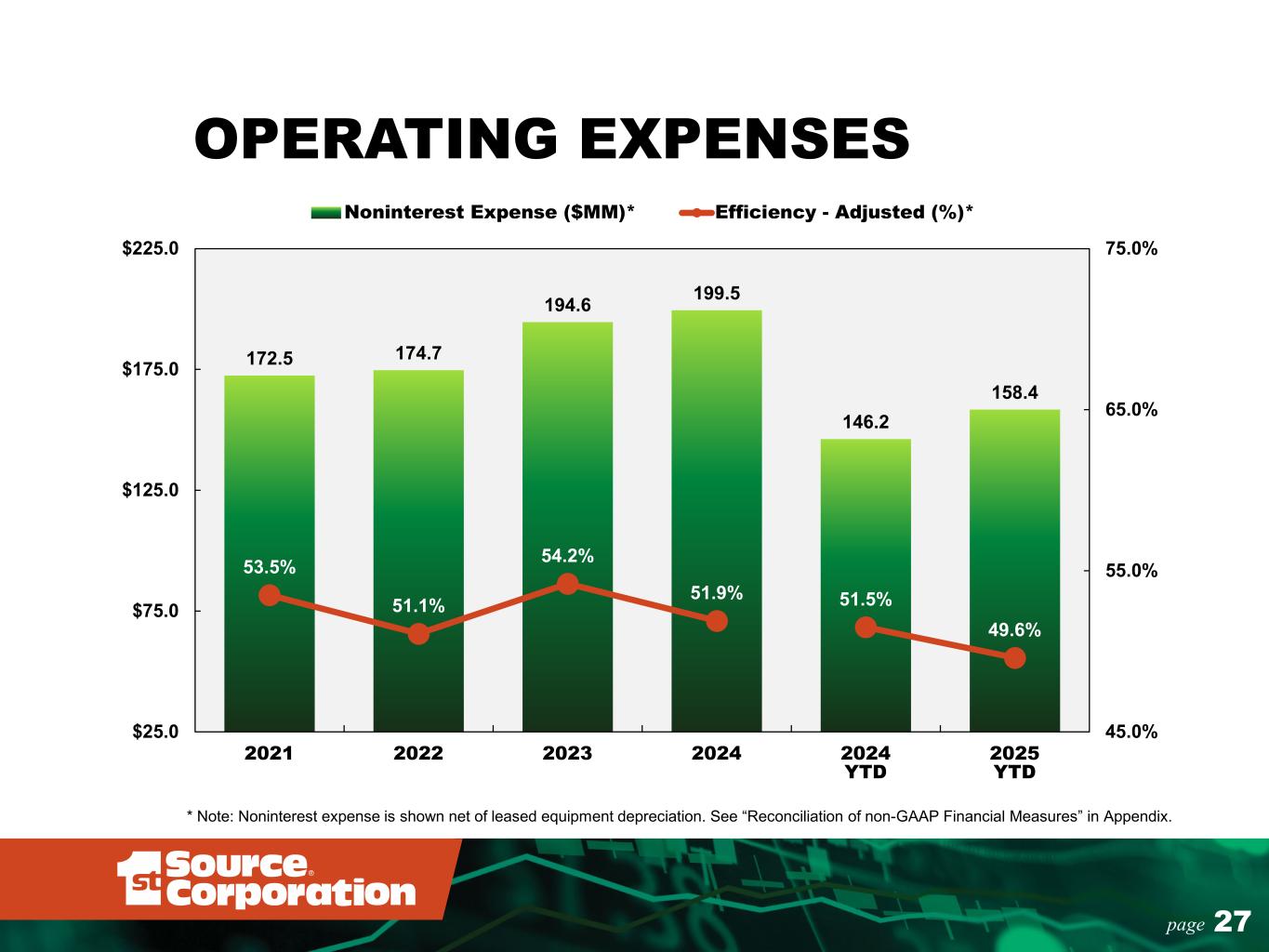 26page Trust, Wealth Advisory, and Retirement Plan Services 31% Other 20% Debit Card 20% Service Charges on Deposit Accounts 15% Insurance Commissions 9% Mortgage Banking 4% Equipment Rental 1% DIVERSE SOURCES OF NONINTEREST INCOME Fair Value of Assets Under Management of $6.1B * Note: Equipment rental income is shown net of leased equipment depreciation. See “Reconciliation of non-GAAP Financial Measures” in Appendix . Noninterest Income Composition 2025 = $66.2MM* 21% of Total Revenue*