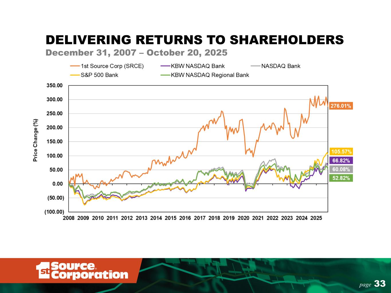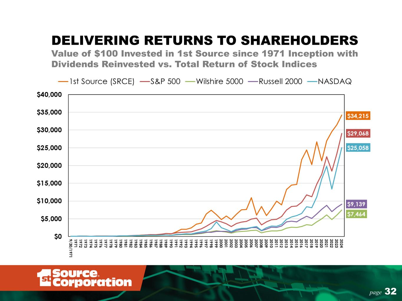 32page DELIVERING RETURNS TO SHAREHOLDERS Value of $100 Invested in 1st Source since 1971 Inception with Dividends Reinvested vs. Total Return of Stock Indices