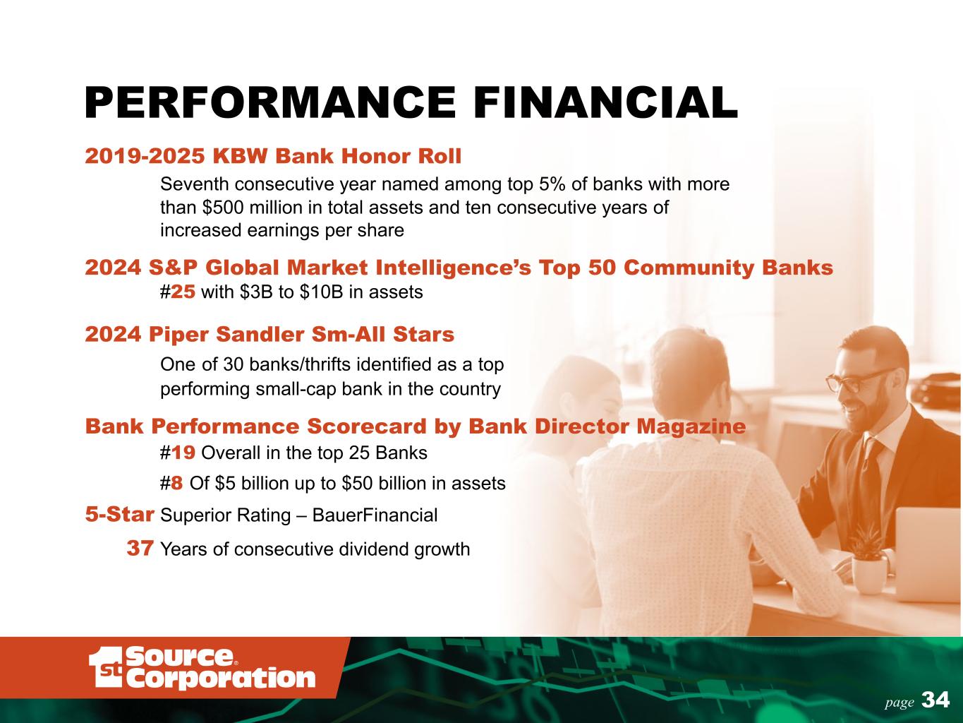 PERFORMANCE FINANCIAL 2019-2025 KBW Bank Honor Roll Seventh consecutive year named among top 5% of banks with more than $500 million in total assets and ten consecutive years of increased earnings per share 2024 S&P Global Market Intelligence’s Top 50 Community Banks #25 with $3B to $10B in assets 2024 Piper Sandler Sm-All Stars One of 30 banks/thrifts identified as a top performing small-cap bank in the country Bank Performance Scorecard by Bank Director Magazine #19 Overall in the top 25 Banks #8 Of $5 billion up to $50 billion in assets 5-Star Superior Rating – BauerFinancial 37 Years of consecutive dividend growth 34page NCIAL
