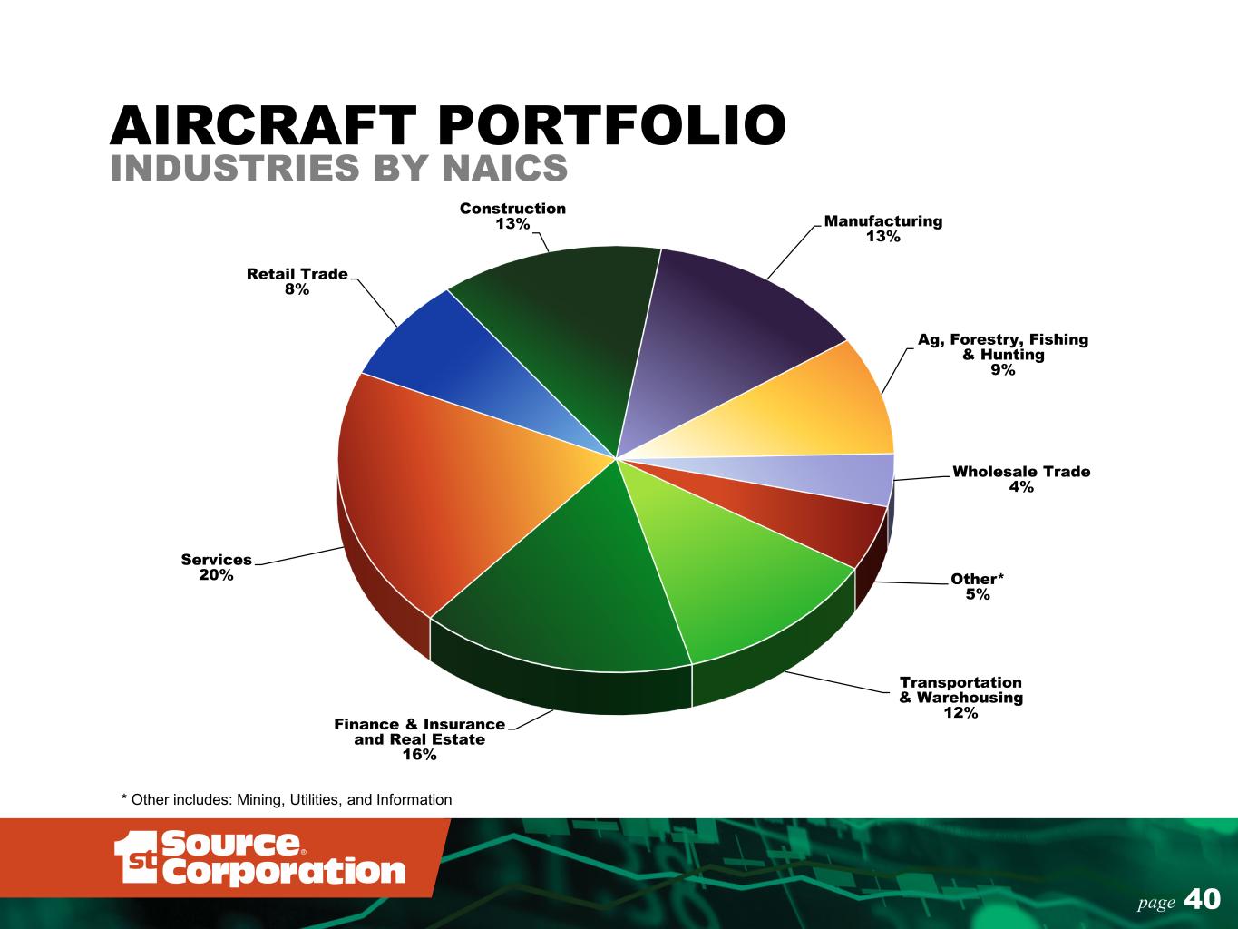 40page Transportation & Warehousing 12% Finance & Insurance and Real Estate 16% Services 20% Retail Trade 8% Construction 13% Manufacturing 13% Ag, Forestry, Fishing & Hunting 9% Wholesale Trade 4% Other* 5% * Other includes: Mining, Utilities, and Information AIRCRAFT PORTFOLIO INDUSTRIES BY NAICS