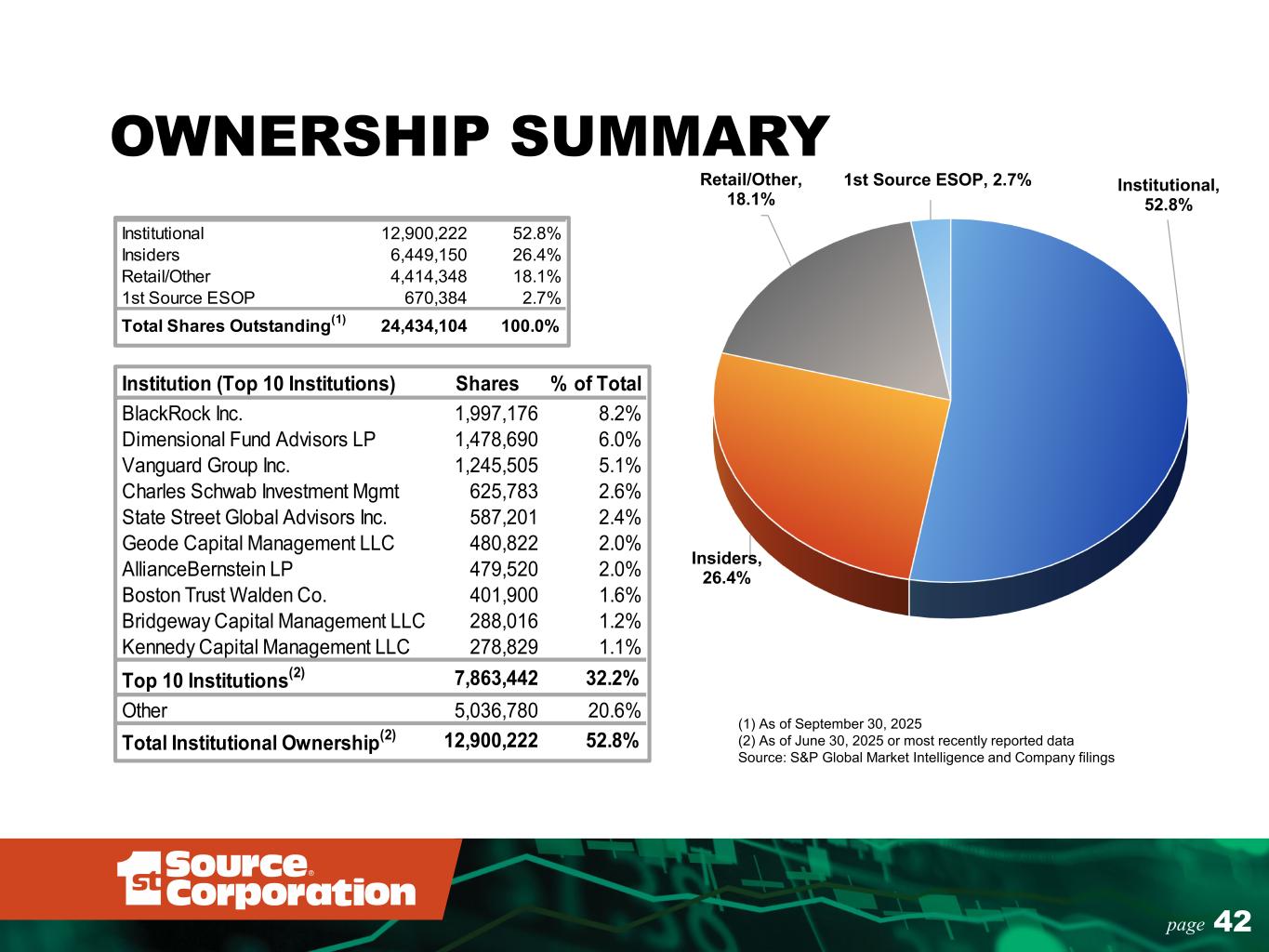 42page OWNERSHIP SUMMARY Institution (Top 10 Institutions) Shares % of Total BlackRock Inc. 1,997,176 8.2% Dimensional Fund Advisors LP 1,478,690 6.0% Vanguard Group Inc. 1,245,505 5.1% Charles Schwab Investment Mgmt 625,783 2.6% State Street Global Advisors Inc. 587,201 2.4% Geode Capital Management LLC 480,822 2.0% AllianceBernstein LP 479,520 2.0% Boston Trust Walden Co. 401,900 1.6% Bridgeway Capital Management LLC 288,016 1.2% Kennedy Capital Management LLC 278,829 1.1% Top 10 Institutions(2) 7,863,442 32.2% Other 5,036,780 20.6% Total Institutional Ownership(2) 12,900,222 52.8% Institutional, 52.8% Insiders, 26.4% Retail/Other, 18.1% 1st Source ESOP, 2.7% (1) As of September 30, 2025 (2) As of June 30, 2025 or most recently reported data Source: S&P Global Market Intelligence and Company filings Institutional 12,900,222 52.8% Insiders 6,449,150 26.4% Retail/Other 4,414,348 18.1% 1st Source ESOP 670,384 2.7% Total Shares Outstanding(1) 24,434,104 100.0%