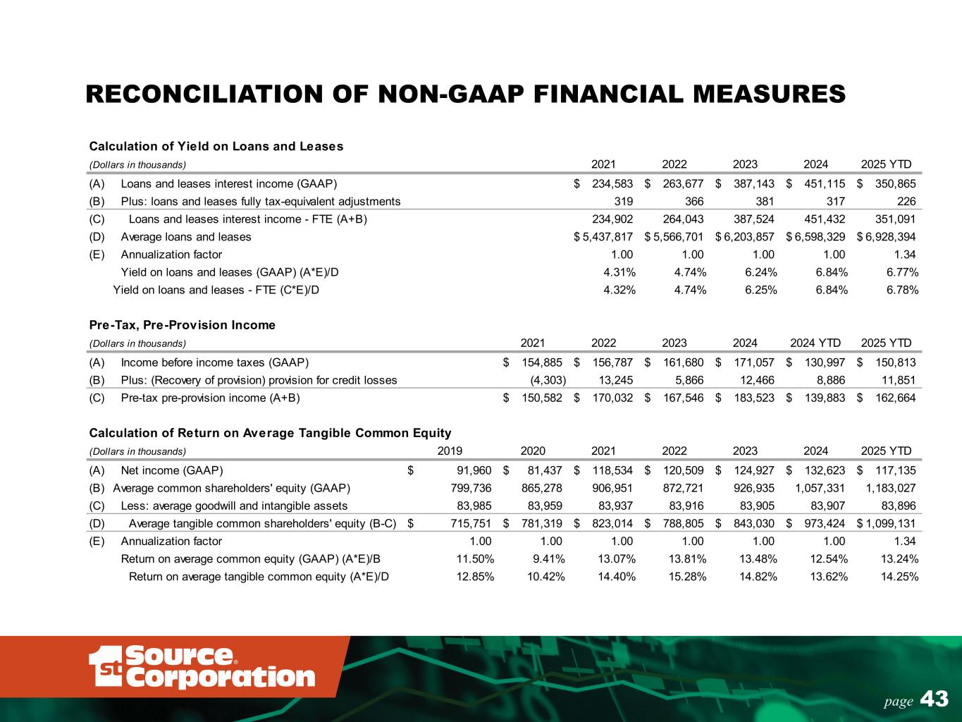 43page RECONCILIATION OF NON-GAAP FINANCIAL MEASURES Calculation of Yield on Loans and Leases (Dollars in thousands) 2021 2022 2023 2024 2025 YTD (A) Loans and leases interest income (GAAP) 234,583$ 263,677$ 387,143$ 451,115$ 350,865$ (B) Plus: loans and leases fully tax-equivalent adjustments 319 366 381 317 226 (C) Loans and leases interest income - FTE (A+B) 234,902 264,043 387,524 451,432 351,091 (D) Average loans and leases 5,437,817$ 5,566,701$ 6,203,857$ 6,598,329$ 6,928,394$ (E) Annualization factor 1.00 1.00 1.00 1.00 1.34 Yield on loans and leases (GAAP) (A*E)/D 4.31% 4.74% 6.24% 6.84% 6.77% Yield on loans and leases - FTE (C*E)/D 4.32% 4.74% 6.25% 6.84% 6.78% Pre-Tax, Pre-Provision Income (Dollars in thousands) 2021 2022 2023 2024 2024 YTD 2025 YTD (A) Income before income taxes (GAAP) 154,885$ 156,787$ 161,680$ 171,057$ 130,997$ 150,813$ (B) Plus: (Recovery of provision) provision for credit losses (4,303) 13,245 5,866 12,466 8,886 11,851 (C) Pre-tax pre-provision income (A+B) 150,582$ 170,032$ 167,546$ 183,523$ 139,883$ 162,664$ Calculation of Return on Average Tangible Common Equity (Dollars in thousands) 2019 2020 2021 2022 2023 2024 2025 YTD (A) Net income (GAAP) 91,960$ 81,437$ 118,534$ 120,509$ 124,927$ 132,623$ 117,135$ (B) 799,736 865,278 906,951 872,721 926,935 1,057,331 1,183,027 (C) Less: average goodwill and intangible assets 83,985 83,959 83,937 83,916 83,905 83,907 83,896 (D) Average tangible common shareholders' equity (B-C) 715,751$ 781,319$ 823,014$ 788,805$ 843,030$ 973,424$ 1,099,131$ (E) Annualization factor 1.00 1.00 1.00 1.00 1.00 1.00 1.34 Return on average common equity (GAAP) (A*E)/B 11.50% 9.41% 13.07% 13.81% 13.48% 12.54% 13.24% Return on average tangible common equity (A*E)/D 12.85% 10.42% 14.40% 15.28% 14.82% 13.62% 14.25% Average common shareholders' equity (GAAP)