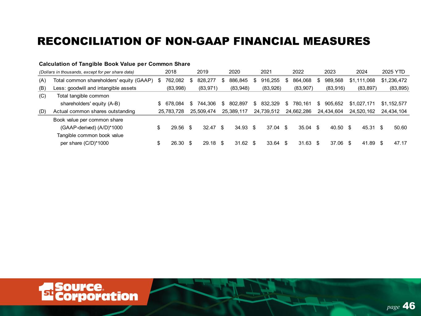 45page RECONCILIATION OF NON-GAAP FINANCIAL MEASURES Calculation of Efficiency Ratio (Dollars in thousands) 2021 2022 2023 2024 2024 YTD 2025 YTD (A) Net interest income (GAAP) 236,638$ 263,469$ 278,647$ 300,817$ 221,451$ 254,880$ (B) Net interest income - FTE 237,097 264,097 279,388 301,403 221,887 255,334 (C) Plus: noninterest income (GAAP) 100,092 91,262 90,623 86,307 67,825 68,066 (D) Less: (gains)/losses on investment securities and partnership investments (1,020) (3,714) (3,875) 809 (2,678) (2,157) (E) Less: depreciation - leased equipment (13,694) (10,023) (7,093) (4,073) (3,194) (1,894) (F) Total net revenue (GAAP) (A+C) 336,730 354,731 369,270 387,124 289,276 322,946 (G) Total net revenue - adjusted (B+C-D-E) 322,475 341,622 359,043 384,446 283,840 319,349 (H) Noninterest expense (GAAP) 186,148 184,699 201,724 203,601 149,393 160,282 (E) Less: depreciation - leased equipment (13,694) (10,023) (7,093) (4,073) (3,194) (1,894) (I) Noninterest expense - adjusted (H-E) 172,454$ 174,676$ 194,631$ 199,528$ 146,199$ 158,388$ Efficiency ratio (GAAP-derived) (H/F) 55.3% 52.1% 54.6% 52.6% 51.6% 49.6% Efficiency ratio - adjusted (I/G) 53.5% 51.1% 54.2% 51.9% 51.5% 49.6% Calculation of Tangible Common Equity-to-Tangible Assets Ratio (Dollars in thousands) 2021 2022 2023 2024 2025 YTD (A) Total common shareholders' equity (GAAP) 916,255$ 864,068$ 989,568$ 1,111,068$ 1,236,472$ (B) Less: goodwill and intangible assets (83,926) (83,907) (83,916) (83,897) (83,895) (C) Total tangible common shareholders' equity (A-B) 832,329 780,161 905,652 1,027,171 1,152,577 (D) Total assets (GAAP) 8,096,289 8,339,416 8,727,958 8,931,938 9,056,691 (B) Less: goodwill and intangible assets (83,926) (83,907) (83,916) (83,897) (83,895) (E) Total tangible assets (D-B) 8,012,363$ 8,255,509$ 8,644,042$ 8,848,041$ 8,972,796$ Common equity-to-assets ratio (GAAP-derived) (A/D) 11.32% 10.36% 11.34% 12.44% 13.65% Tangible common equity-to-tangible assets ratio (C/E) 10.39% 9.45% 10.48% 11.61% 12.85%