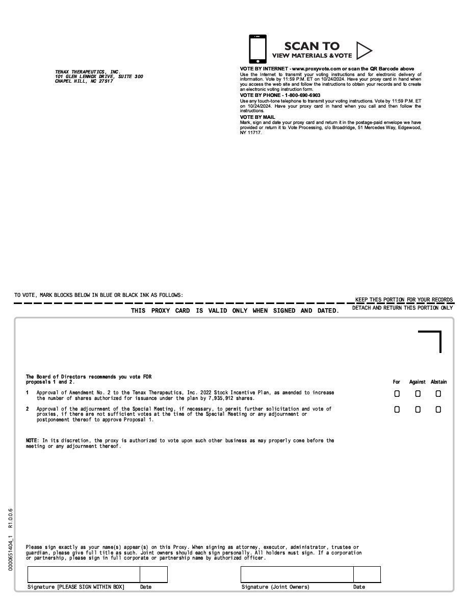 The Special Meeting will be held on October 25, 2024 at the offices of Tenax Therapeutics, Inc. at 101 Glen Lennox Drive, Suite 300, Chapel Hill, North Carolina 27517 at 9:00 a.m., Eastern Time. Requests for directions to the Special Meeting location may be directed to Tenax Therapeutics, Inc., Attn: Corporate Secretary, 101 Glen Lennox Drive, Suite 300, Chapel Hill, North Carolina 27517.