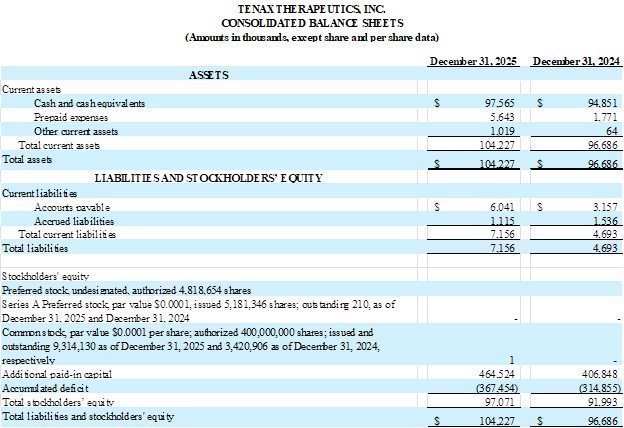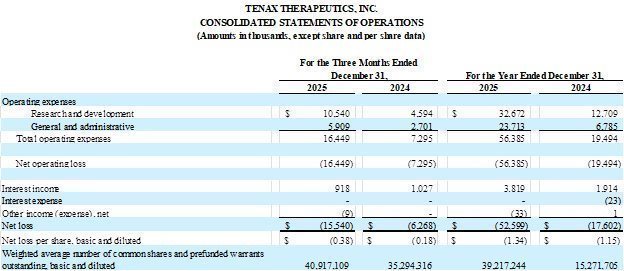 Net loss: Tenax Therapeutics reported a net loss of $15.5 million for the fourth quarter of 2025, compared to a net loss of $6.3 million for the fourth quarter of 2024. Tenax Therapeutics reported a net loss of $52.6 million for the year ended December 31, 2025, compared to a net loss of $17.6 million for the year ended December 31, 2024.