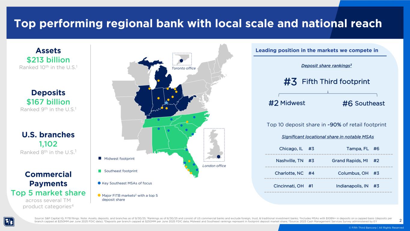 2 © Fifth Third Bancorp | All Rights Reserved Top performing regional bank with local scale and national reach Midwest footprint Major FITB markets2 with a top 5 deposit share Key Southeast MSAs of focus Assets $213 billion Ranked 10th in the U.S.1 Deposits $167 billion Ranked 9th in the U.S.1 U.S. branches 1,102 Ranked 8th in the U.S.1 Commercial Payments Top 5 market share across several TM product categories4 Southeast footprint Leading position in the markets we compete in Toronto office London office Source: S&P Capital IQ, FITB filings. Note: Assets, deposits, and branches as of 9/30/25; 1Rankings as of 6/30/25 and consist of US commercial banks and exclude foreign, trust, & traditional investment banks; 2Includes MSAs with $10BN+ in deposits on a capped basis (deposits per branch capped at $250MM per June 2025 FDIC data); 3Deposits per branch capped at $250MM per June 2025 FDIC data; Midwest and Southeast rankings represent in footprint deposit market share; 4Source: 2023 Cash Management Services Survey administered by EY Deposit share rankings3 #2 #6Midwest Southeast #3 Fifth Third footprint Significant locational share in notable MSAs Nashville, TN Charlotte, NC #3 #4 Cincinnati, OH #1 Chicago, IL #3 Top 10 deposit share in ~90% of retail footprint Columbus, OH Indianapolis, IN #3 #3 Tampa, FL #6 Grand Rapids, MI #2