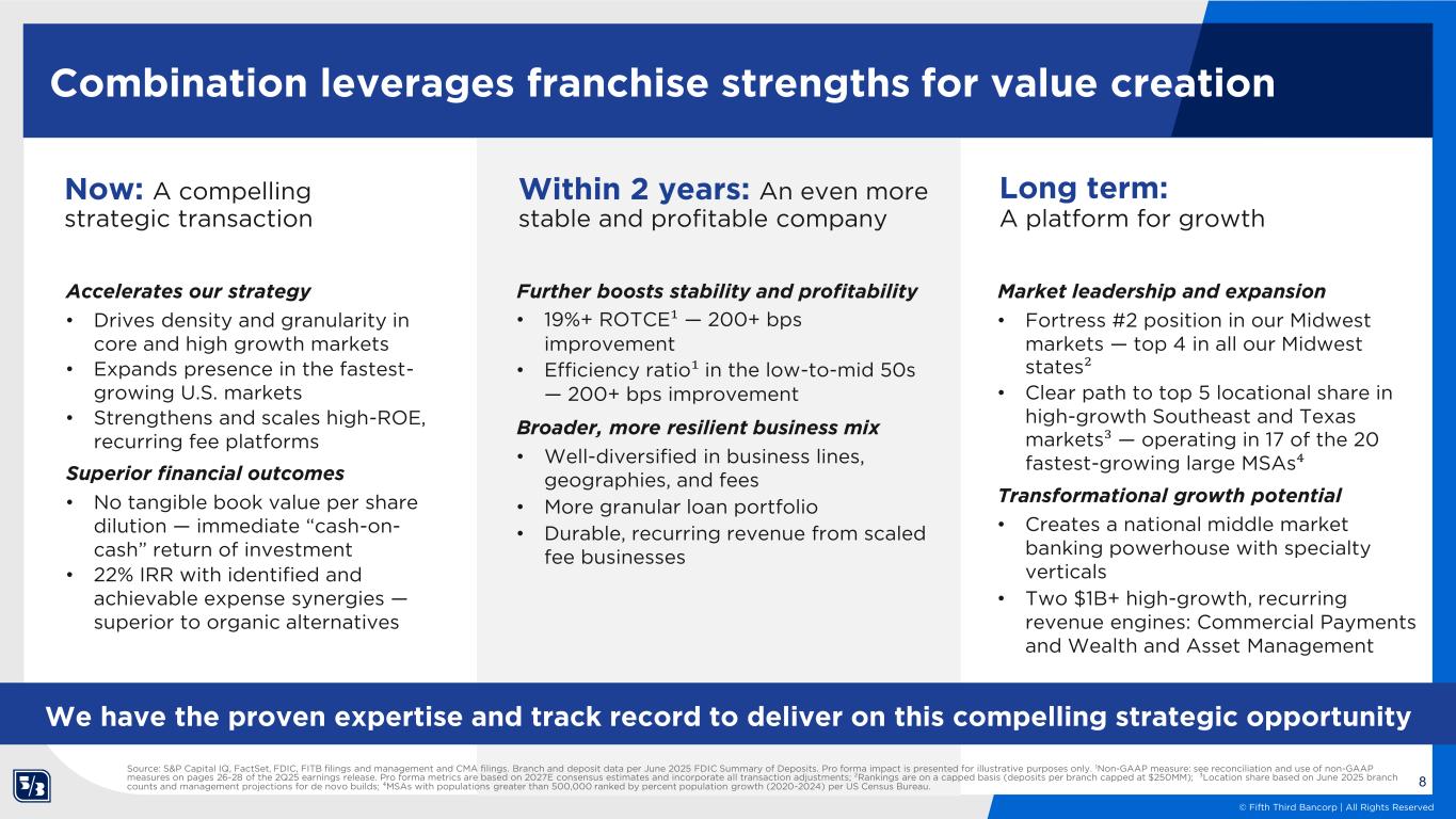 ibdroot\projects\IBD-NY\burger2025\973442_1\Presentations\05. Investor Presentation\PPT\Project Express Investor Presentation_v24.pptx 7 © Fifth Third Bancorp | All Rights Reserved Fifth Third and Comerica: Advancing growth and profitability Now: A compelling strategic transaction Within 2 years: An even more stable and profitable company Assets² $288B Deposits² $224B Loans² $174B Creating the 9th Largest U.S. Bank¹ Long-term: A platform for growth Source: S&P Capital IQ, FactSet, FITB filings and management and CMA filings. Financial data as of June 30, 2025. ¹Based on total assets. Ranking consists of US commercial banks and excludes foreign, trust, and traditional investment banks; ²Pro forma balance sheet metrics as of June 30, 2025 and exclude purchase accounting adjustments for illustrative purposes.