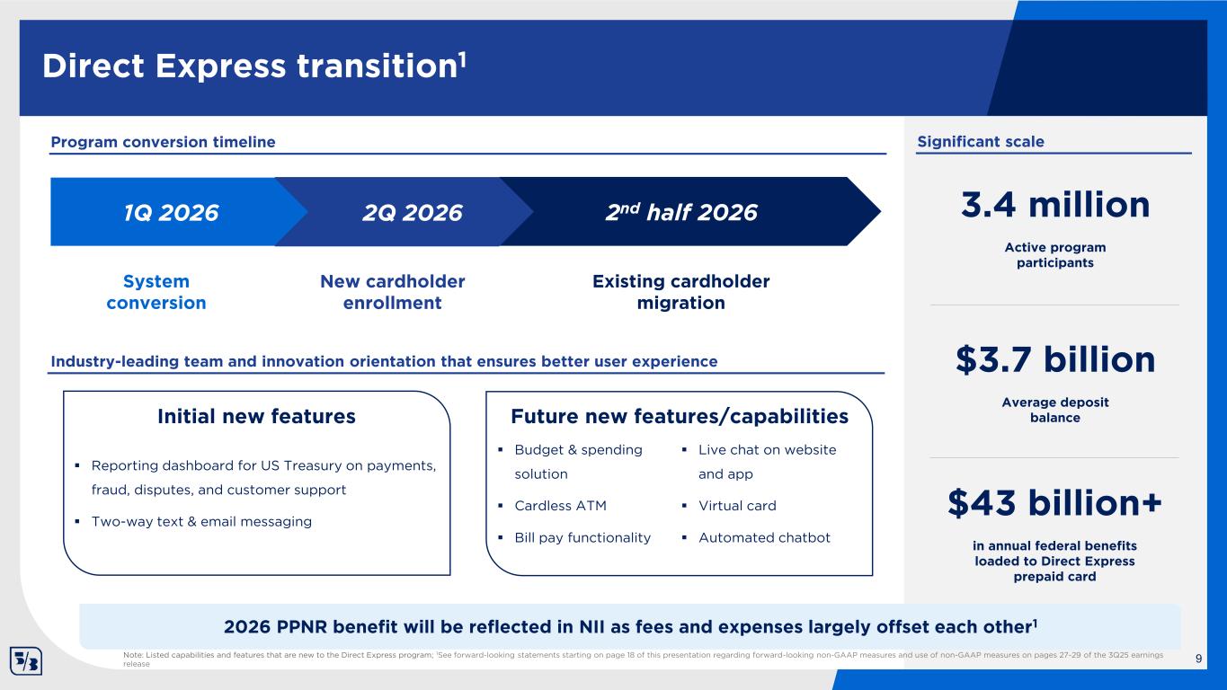 9 Direct Express transition1 Program conversion timeline 3.4 million Active program participants Industry-leading team and innovation orientation that ensures better user experience Future new features/capabilities ▪ Budget & spending solution ▪ Cardless ATM ▪ Bill pay functionality ▪ Live chat on website and app ▪ Virtual card ▪ Automated chatbot 2nd half 20262Q 20261Q 2026 System conversion New cardholder enrollment Existing cardholder migration $3.7 billion Average deposit balance $43 billion+ in annual federal benefits loaded to Direct Express prepaid card Significant scale Initial new features ▪ Reporting dashboard for US Treasury on payments, fraud, disputes, and customer support ▪ Two-way text & email messaging 2026 PPNR benefit will be reflected in NII as fees and expenses largely offset each other1 Note: Listed capabilities and features that are new to the Direct Express program; 1See forward-looking statements starting on page 18 of this presentation regarding forward-looking non-GAAP measures and use of non-GAAP measures on pages 27-29 of the 3Q25 earnings release