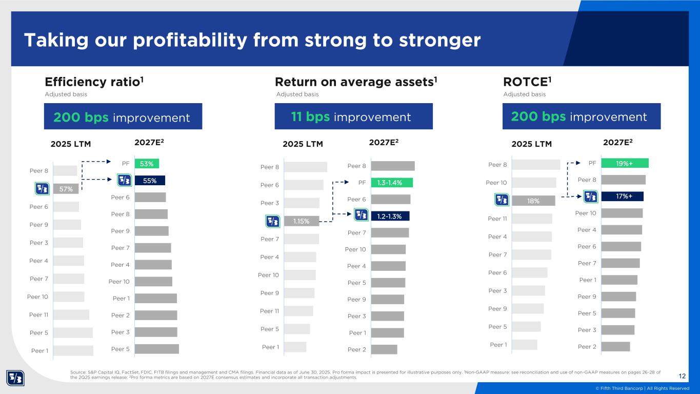 11 © Fifth Third Bancorp | All Rights Reserved Combination leverages franchise strengths for value creation Now: A compelling strategic transaction Accelerates our strategy • Drives density and granularity in core and high growth markets • Expands presence in the fastest- growing U.S. markets • Strengthens and scales high-ROE, recurring fee platforms Superior financial outcomes • No tangible book value per share dilution — immediate “cash-on- cash” return of investment • 22% IRR with identified and achievable expense synergies — superior to organic alternatives Long term: A platform for growth Within 2 years: An even more stable and profitable company We have the proven expertise and track record to deliver on this compelling strategic opportunity Market leadership and expansion • Fortress #2 position in our Midwest markets — top 4 in all our Midwest states² • Clear path to top 5 locational share in high-growth Southeast and Texas markets³ — operating in 17 of the 20 fastest-growing large MSAs⁴ Transformational growth potential • Creates a national middle market banking powerhouse with specialty verticals • Two $1B+ high-growth, recurring revenue engines: Commercial Payments and Wealth and Asset Management Further boosts stability and profitability • 19%+ ROTCE¹ — 200+ bps improvement • Efficiency ratio¹ in the low-to-mid 50s — 200+ bps improvement Broader, more resilient business mix • Well-diversified in business lines, geographies, and fees • More granular loan portfolio • Durable, recurring revenue from scaled fee businesses Source: S&P Capital IQ, FactSet, FDIC, FITB filings and management and CMA filings. Branch and deposit data per June 2025 FDIC Summary of Deposits. Pro forma impact is presented for illustrative purposes only. 1Non-GAAP measure: see reconciliation and use of non-GAAP measures on pages 26-28 of the 2Q25 earnings release. Pro forma metrics are based on 2027E consensus estimates and incorporate all transaction adjustments; ²Rankings are on a capped basis (deposits per branch capped at $250MM); ³Location share based on June 2025 branch counts and management projections for de novo builds; ⁴MSAs with populations greater than 500,000 ranked by percent population growth (2020-2024) per US Census Bureau.