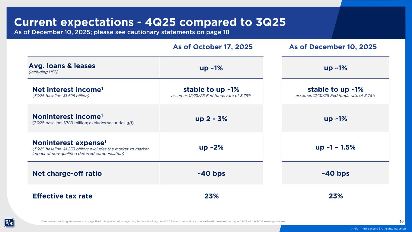 16 © Fifth Third Bancorp | All Rights Reserved Current expectations - 4Q25 compared to 3Q25 As of December 10, 2025; please see cautionary statements on page 18 Avg. loans & leases (Including HFS) up ~1% Net interest income1 (3Q25 baseline: $1.525 billion) stable to up ~1% assumes 12/31/25 Fed funds rate of 3.75% Noninterest income1 (3Q25 baseline: $789 million; excludes securities g/l) up 2 - 3% Noninterest expense1 (3Q25 baseline: $1.253 billion; excludes the market-to market impact of non-qualified deferred compensation) up ~2% Net charge-off ratio ~40 bps Effective tax rate 23% As of October 17, 2025 up ~1% stable to up ~1% assumes 12/31/25 Fed funds rate of 3.75% up ~1% up ~1 – 1.5% ~40 bps 23% As of December 10, 2025 1See forward-looking statements on page 18 of this presentation regarding forward-looking non-GAAP measures and use of non-GAAP measures on pages 27-29 of the 3Q25 earnings release