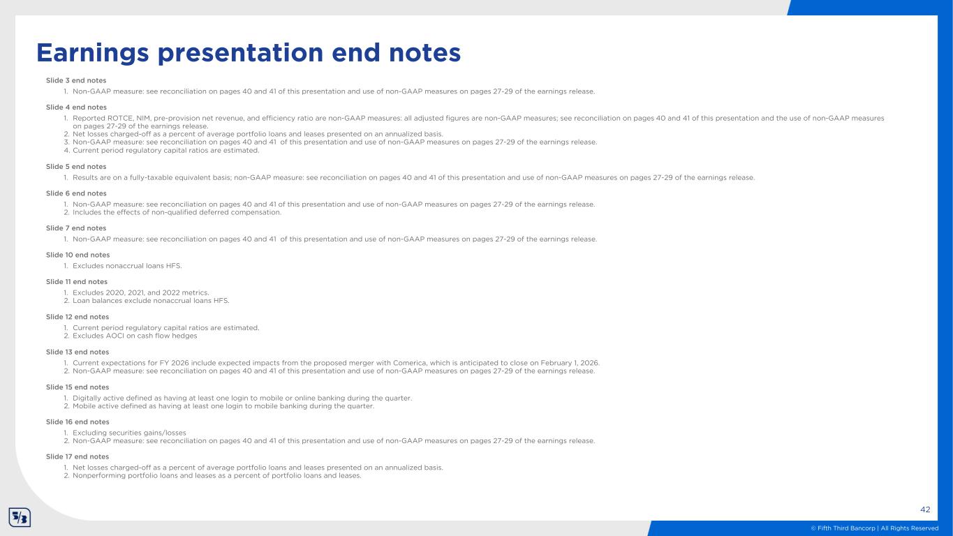 © Fifth Third Bancorp | All Rights Reserved 42 Earnings presentation end notes Slide 3 end notes 1. Non-GAAP measure: see reconciliation on pages 40 and 41 of this presentation and use of non-GAAP measures on pages 27-29 of the earnings release. Slide 4 end notes 1. Reported ROTCE, NIM, pre-provision net revenue, and efficiency ratio are non-GAAP measures: all adjusted figures are non-GAAP measures; see reconciliation on pages 40 and 41 of this presentation and the use of non-GAAP measures on pages 27-29 of the earnings release. 2. Net losses charged-off as a percent of average portfolio loans and leases presented on an annualized basis. 3. Non-GAAP measure: see reconciliation on pages 40 and 41 of this presentation and use of non-GAAP measures on pages 27-29 of the earnings release. 4. Current period regulatory capital ratios are estimated. Slide 5 end notes 1. Results are on a fully-taxable equivalent basis; non-GAAP measure: see reconciliation on pages 40 and 41 of this presentation and use of non-GAAP measures on pages 27-29 of the earnings release. Slide 6 end notes 1. Non-GAAP measure: see reconciliation on pages 40 and 41 of this presentation and use of non-GAAP measures on pages 27-29 of the earnings release. 2. Includes the effects of non-qualified deferred compensation. Slide 7 end notes 1. Non-GAAP measure: see reconciliation on pages 40 and 41 of this presentation and use of non-GAAP measures on pages 27-29 of the earnings release. Slide 10 end notes 1. Excludes nonaccrual loans HFS. Slide 11 end notes 1. Excludes 2020, 2021, and 2022 metrics. 2. Loan balances exclude nonaccrual loans HFS. Slide 12 end notes 1. Current period regulatory capital ratios are estimated. 2. Excludes AOCI on cash flow hedges Slide 13 end notes 1. Current expectations for FY 2026 include expected impacts from the proposed merger with Comerica, which is anticipated to close on February 1, 2026. 2. Non-GAAP measure: see reconciliation on pages 40 and 41 of this presentation and use of non-GAAP measures on pages 27-29 of the earnings release. Slide 15 end notes 1. Digitally active defined as having at least one login to mobile or online banking during the quarter. 2. Mobile active defined as having at least one login to mobile banking during the quarter. Slide 16 end notes 1. Excluding securities gains/losses 2. Non-GAAP measure: see reconciliation on pages 40 and 41 of this presentation and use of non-GAAP measures on pages 27-29 of the earnings release. Slide 17 end notes 1. Net losses charged-off as a percent of average portfolio loans and leases presented on an annualized basis. 2. Nonperforming portfolio loans and leases as a percent of portfolio loans and leases.