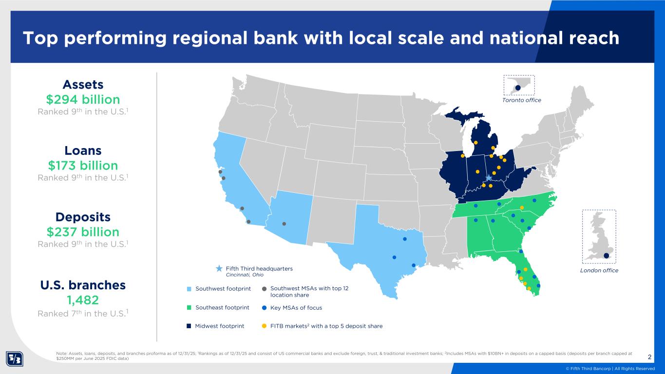 2 © Fifth Third Bancorp | All Rights Reserved Southwest footprint Top performing regional bank with local scale and national reach Assets $294 billion Ranked 9th in the U.S.1 Deposits $237 billion Ranked 9th in the U.S.1 U.S. branches 1,482 Ranked 7th in the U.S.1 Note: Assets, loans, deposits, and branches proforma as of 12/31/25; 1Rankings as of 12/31/25 and consist of US commercial banks and exclude foreign, trust, & traditional investment banks; 2Includes MSAs with $10BN+ in deposits on a capped basis (deposits per branch capped at $250MM per June 2025 FDIC data) Midwest footprint FITB markets2 with a top 5 deposit share Southwest MSAs with top 12 location share Southeast footprint Loans $173 billion Ranked 9th in the U.S.1 Fifth Third headquarters Cincinnati, Ohio Key MSAs of focus Toronto office London office