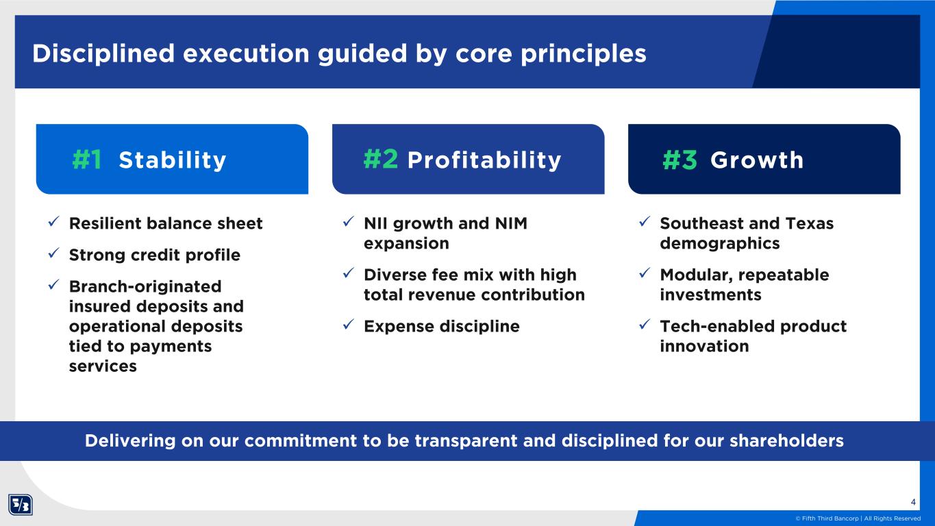3 © Fifth Third Bancorp | All Rights Reserved NII contribution1 43% 53% 4% 51% 32% 17%Fee contribution1 A simple, diversified business portfolio • Texas Commercial Banking Loans $55B Deposits $117B Loans $10B Deposits $14B Loans $111B Deposits $99B Consumer & Small Business Banking Wealth & Asset Management Lending / Deposits / Capital Markets / Treasury Management & Payments Lending / Deposits / Payments Wealth Management / Trust / Custody NII contribution1 Fee contribution1 NII contribution1 Fee contribution1 Business Offerings Business Offerings Business Offerings Note: "World's Most Ethical Companies" and "Ethisphere" names and marks are registered trademarks of Ethisphere LLC.“; #1 for Retail Banking Customer Satisfaction in Florida and the Best Mobile Banking App for Customer Satisfaction among Regional Banks. Tied in 2025. For J.D. Power 2025 award information, visit jdpower.com/awards. J.D. Power 2025 U.S. Banking Mobile App Satisfaction Study; among banks with $65B to $250B in deposits. Visit jdpower.com/awards for more details. 1Source: FITB filings and management and CMA filings proforma as of December 31, 2025, presented as a percent of 4Q25 segment revenue, which excludes Other Corporate