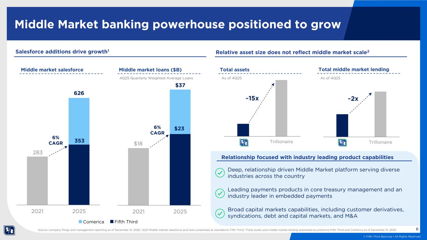 5 © Fifth Third Bancorp | All Rights Reserved 1 Peer 1 65% Peer 2 68% FITB 136% Peer 7 429% 2 Peer 5 55% Peer 1 68% Peer 7 126% FITB 359% 3 FITB 54% FITB 65% Peer 1 121% Peer 1 354% 4 Peer 6 52% Peer 5 64% Peer 6 117% Peer 6 262% 5 Peer 7 37% Peer 7 60% Peer 2 99% Peer 10 255% 6 Peer 4 33% Peer 6 47% Peer 4 64% Peer 4 194% 7 Peer 9 32% Peer 3 33% Peer 3 61% Peer 3 190% 8 Peer 10 27% Peer 9 32% Peer 5 57% Peer 5 179% 9 Peer 3 26% Peer 4 26% Peer 10 42% Peer 2 177% 10 Peer 8 24% Peer 10 24% Peer 9 41% Peer 8 130% 11 Peer 2 7% Peer 8 6% Peer 8 32% Peer 9 103% 3 Year 5 Year 7 Year 10 Year Delivering shareholder outperformance Total shareholder return Source: S&P Capital IQ, Bloomberg Finance L.P. Note: Trailing TSR as of 2/28/2026 Producing top quartile total shareholder returns consistently