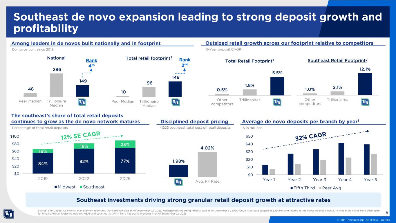 7 © Fifth Third Bancorp | All Rights Reserved Accelerating our decade-long network expansion1 Branch distribution by region2 Source: S&P Capital IQ; 1See forward-looking statements on page 15 of this presentation regarding forward-looking non-GAAP measures and use of non-GAAP measures on pages 27-29 of the 4Q25 earnings release; 2Represents % of total branches by geographic region and includes 150 planned de novo builds in Texas; 3Population growth represented as 5-year projected growth rate (2026-2031 not annualized) per S&P Capital IQ. Overall growth rate calculated as population growth rate weighted by branch distribution (based on Fifth Third and Comerica’s proforma branch counts) by region; 4MSAs with populations greater than 500,000 ranked by percent population growth (2020-2024) per US Census Bureau. By 2030, 50+% of Fifth Third’s footprint will be in the best markets in the U.S., including 17 of the 20 fastest growing large U.S. metros4 76% 24% 1,154 branches 2017 2025 2028 (Pre-CMA) 2030E 67% 33% 1,130 branches ~50%~50% ~1,250 branches ~45% ~35% ~20% ~1,750 branches Midwest footprint Southeast footprint Southwest footprint P o p u la ti o n g ro w th 3 2.5% 3.1% 3.8% 4.1%