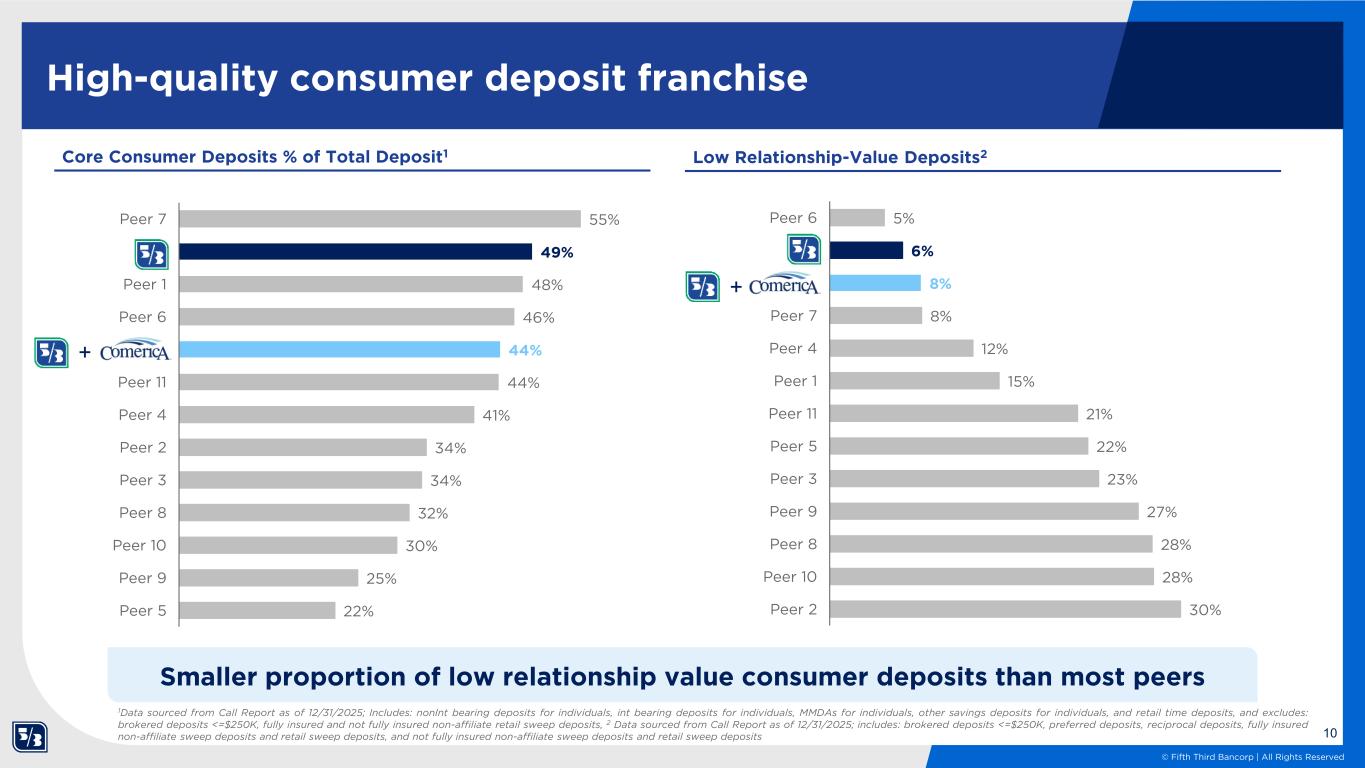 9 © Fifth Third Bancorp | All Rights Reserved 26 43 89 137 100 93 305 215 150 7 8 11 26 126 42 136 52 394 502 Peer 5 Peer 4 Peer 10 Peer 1 Peer 7 Peer 9 Peer 8 Peer 3 Peer 6 * Peer-leading deposit growth opportunity # of branches aged less than 5 years at year end 20301 Source: S&P Global Market Intelligence and FDIC as of June 30, 2025. Notes: Deposits capped at $1bn per branch. 1See forward-looking statements starting on page 15 of this presentation regarding forward-looking non-GAAP measures and use of non-GAAP measures on pages 27-29 of the 4Q25 earnings release; 2Reflects percentage of total branches less than 5 years old at YE2030 as a percentage of total branches; 3Assumes de novo branches achieve peer average of $35MM deposits by year 5; 4Embedded opportunity as a percentage of June 2025 capped deposits. % <5yrs at YE2030E2 25% 11% 0% 8% 0% 5% 0% 0% 0% 0% SE De Novo TX De Novo L5Y Builds (June 2025) Announced De Novo Programs $0.2 $0.3 $0.4 $0.9 $4.4 $1.5 $4.8 $1.8 $13.8 $25.1 Peer 5 Peer 4 Peer 10 Peer 1 Peer 7 Peer 9 Peer 8 Peer 3 Peer 6 * Total deposit opportunity for branches aged less than 5 years3 Deposit Growth %4 18.7% 4.5% 0.7% 3.9% 1.2% 1.7% 0.7% 0.7% 0.3% 0.2% Given FITB’s peer-leading track record ($50MM de novo deposits per branch vs. $35MM peer avg.), its ~350 young branches should deliver deposit growth above peers Peer average ($35MM) Fifth Third branches ($50MM) $ billions