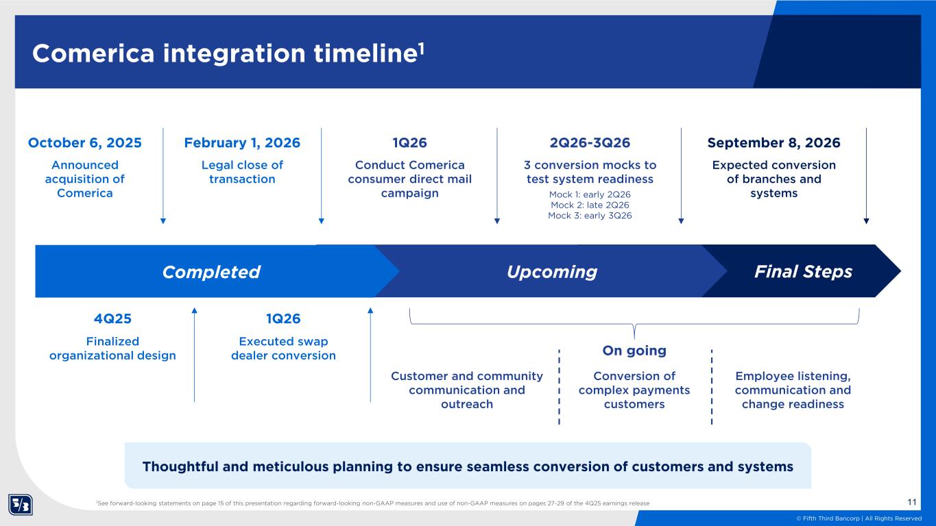 10 © Fifth Third Bancorp | All Rights Reserved 22% 25% 30% 32% 34% 34% 41% 44% 44% 46% 48% 49% 55% Peer 5 Peer 9 Peer 10 Peer 8 Peer 3 Peer 2 Peer 4 Peer 11 xx Peer 6 Peer 1 x Peer 7 Smaller proportion of low relationship value consumer deposits than most peers High-quality consumer deposit franchise Core Consumer Deposits % of Total Deposit1 1Data sourced from Call Report as of 12/31/2025; Includes: nonInt bearing deposits for individuals, int bearing deposits for individuals, MMDAs for individuals, other savings deposits for individuals, and retail time deposits, and excludes: brokered deposits <=$250K, fully insured and not fully insured non-affiliate retail sweep deposits, 2 Data sourced from Call Report as of 12/31/2025; includes: brokered deposits <=$250K, preferred deposits, reciprocal deposits, fully insured non-affiliate sweep deposits and retail sweep deposits, and not fully insured non-affiliate sweep deposits and retail sweep deposits 30% 28% 28% 27% 23% 22% 21% 15% 12% 8% 8% 6% 5% Peer 2 Peer 10 Peer 8 Peer 9 Peer 3 Peer 5 Peer 11 Peer 1 Peer 4 Peer 7 xx x Peer 6 Low Relationship-Value Deposits2 + +