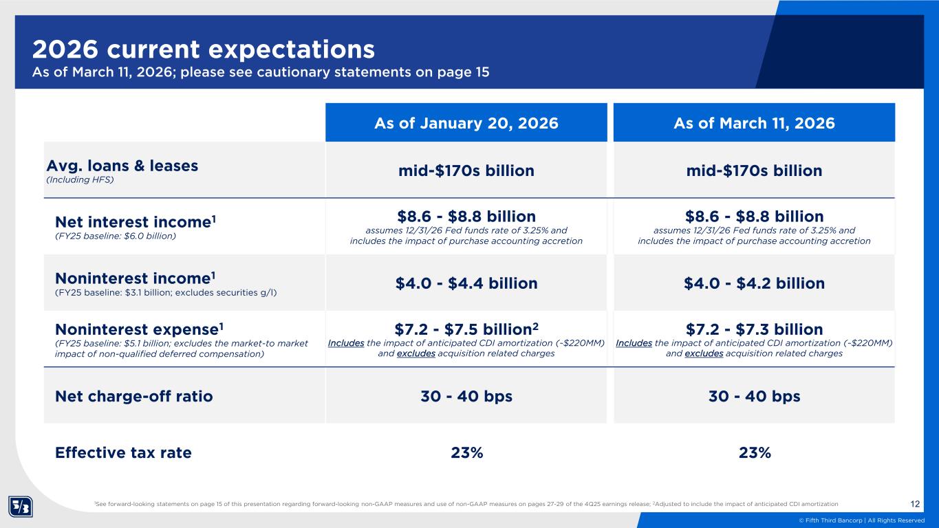 11 © Fifth Third Bancorp | All Rights Reserved Final StepsUpcoming Comerica integration timeline1 Completed October 6, 2025 Announced acquisition of Comerica 4Q25 Finalized organizational design February 1, 2026 Legal close of transaction 2Q26-3Q26 3 conversion mocks to test system readiness Conversion of complex payments customers September 8, 2026 Expected conversion of branches and systems Thoughtful and meticulous planning to ensure seamless conversion of customers and systems On going 1See forward-looking statements on page 15 of this presentation regarding forward-looking non-GAAP measures and use of non-GAAP measures on pages 27-29 of the 4Q25 earnings release 1Q26 Executed swap dealer conversion 1Q26 Conduct Comerica consumer direct mail campaign Mock 1: early 2Q26 Mock 2: late 2Q26 Mock 3: early 3Q26 Employee listening, communication and change readiness Customer and community communication and outreach