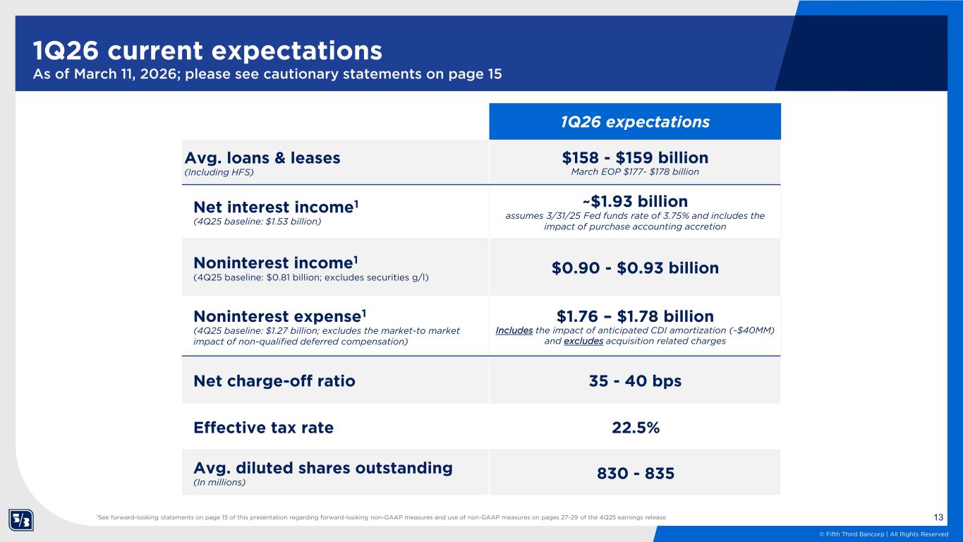 12 © Fifth Third Bancorp | All Rights Reserved As of January 20, 2026 As of March 11, 2026 Avg. loans & leases (Including HFS) mid-$170s billion mid-$170s billion Net interest income1 (FY25 baseline: $6.0 billion) $8.6 - $8.8 billion assumes 12/31/26 Fed funds rate of 3.25% and includes the impact of purchase accounting accretion $8.6 - $8.8 billion assumes 12/31/26 Fed funds rate of 3.25% and includes the impact of purchase accounting accretion Noninterest income1 (FY25 baseline: $3.1 billion; excludes securities g/l) $4.0 - $4.4 billion $4.0 - $4.2 billion Noninterest expense1 (FY25 baseline: $5.1 billion; excludes the market-to market impact of non-qualified deferred compensation) $7.2 - $7.5 billion2 Includes the impact of anticipated CDI amortization (~$220MM) and excludes acquisition related charges $7.2 - $7.3 billion Includes the impact of anticipated CDI amortization (~$220MM) and excludes acquisition related charges Net charge-off ratio 30 - 40 bps 30 - 40 bps Effective tax rate 23% 23% 1See forward-looking statements on page 15 of this presentation regarding forward-looking non-GAAP measures and use of non-GAAP measures on pages 27-29 of the 4Q25 earnings release; 2Adjusted to include the impact of anticipated CDI amortization 2026 current expectations As of March 11, 2026; please see cautionary statements on page 15
