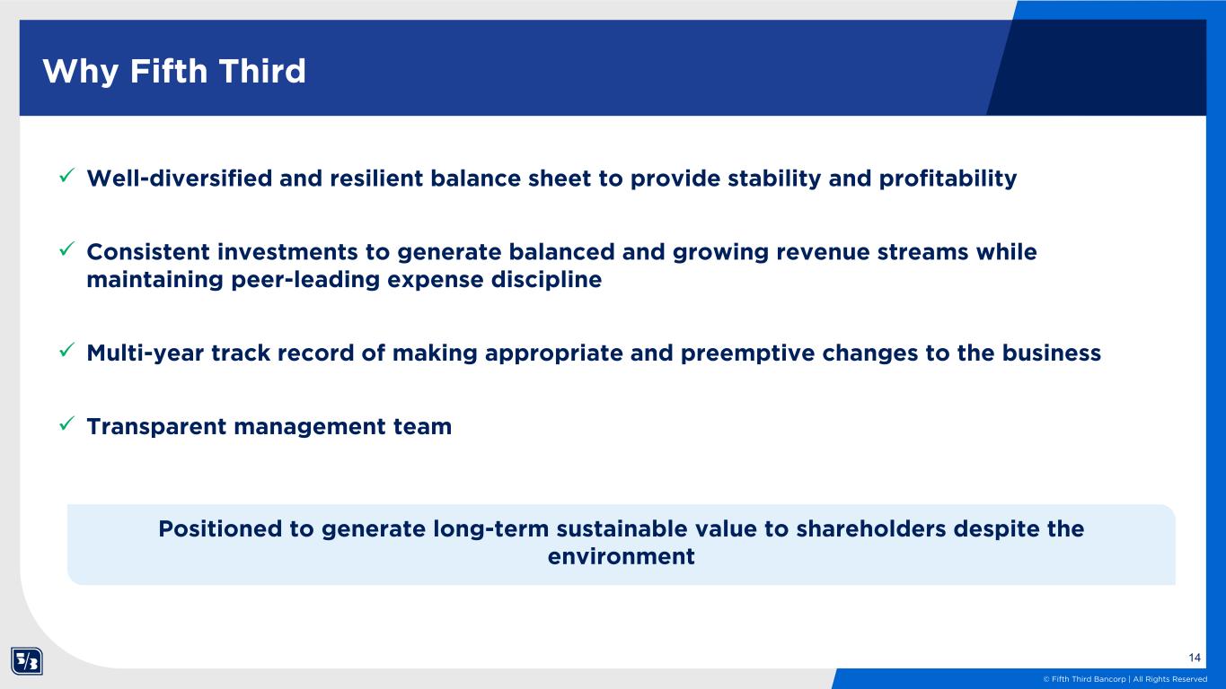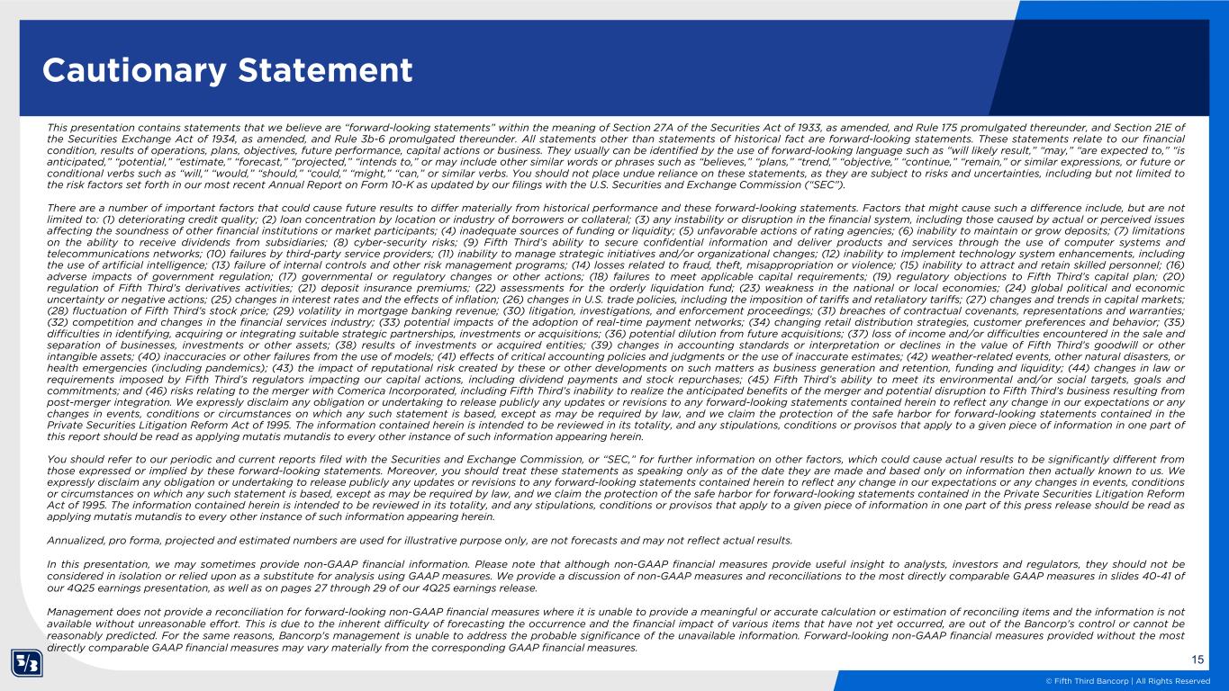 13 © Fifth Third Bancorp | All Rights Reserved 1Q26 current expectations As of March 11, 2026; please see cautionary statements on page 15 1Q26 expectations Avg. loans & leases (Including HFS) $158 - $159 billion March EOP $177- $178 billion Net interest income1 (4Q25 baseline: $1.53 billion) ~$1.93 billion assumes 3/31/25 Fed funds rate of 3.75% and includes the impact of purchase accounting accretion Noninterest income1 (4Q25 baseline: $0.81 billion; excludes securities g/l) $0.90 - $0.93 billion Noninterest expense1 (4Q25 baseline: $1.27 billion; excludes the market-to market impact of non-qualified deferred compensation) $1.76 – $1.78 billion Includes the impact of anticipated CDI amortization (~$40MM) and excludes acquisition related charges Net charge-off ratio 35 - 40 bps Effective tax rate 22.5% Avg. diluted shares outstanding (In millions) 830 - 835 1See forward-looking statements on page 15 of this presentation regarding forward-looking non-GAAP measures and use of non-GAAP measures on pages 27-29 of the 4Q25 earnings release