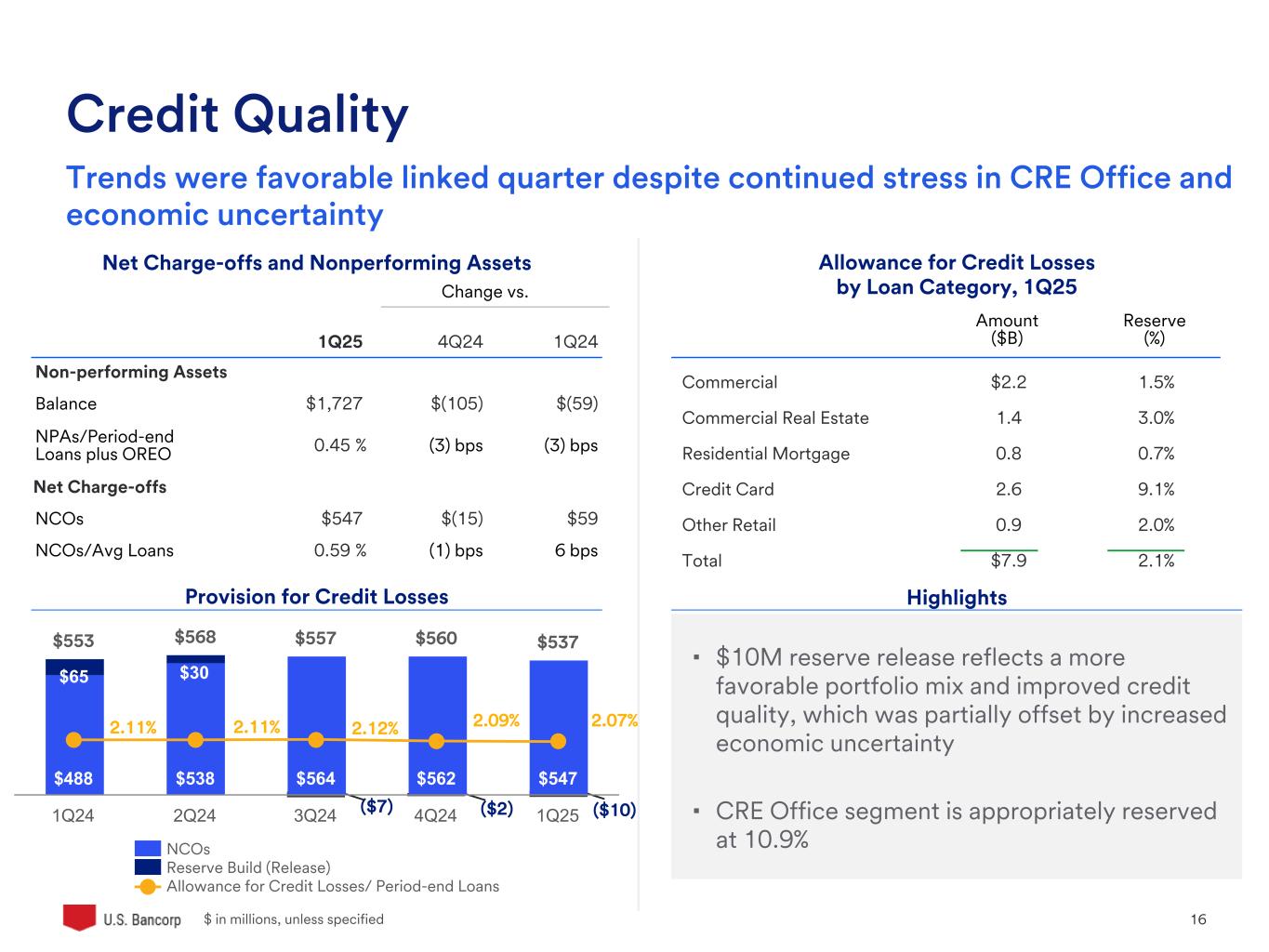U.S. Bancorp 15 ▪ Year-over-year adjusted noninterest expense increase was driven by increases across several categories, which was partially offset by lower compensation and benefits, as well as professional services ▪ On a linked quarter basis, adjusted noninterest expense increased slightly due to seasonally higher compensation and benefits, marketing and business development, and all other expense categories $ in millions 1 Non-GAAP; see the appendix for calculations and description of notable items 1Q25 4Q24 1Q24 Compensation and benefits $2,637 $2,607 $2,691 Technology and communications 533 534 507 Occupancy and equipment 306 317 296 Professional services 98 135 110 Marketing and business development 182 160 136 All other 476 449 454 Total Noninterest Expense, Adjusted1 $4,232 $4,202 $4,194 Notable Items1 — 109 265 Total Noninterest Expense, Reported $4,232 $4,311 $4,459 Noninterest Expense Reported -1.8% Linked Quarter -5.1% Year-Over-Year Excluding Notable Items1 +0.7% Linked Quarter +0.9% Year-Over-Year