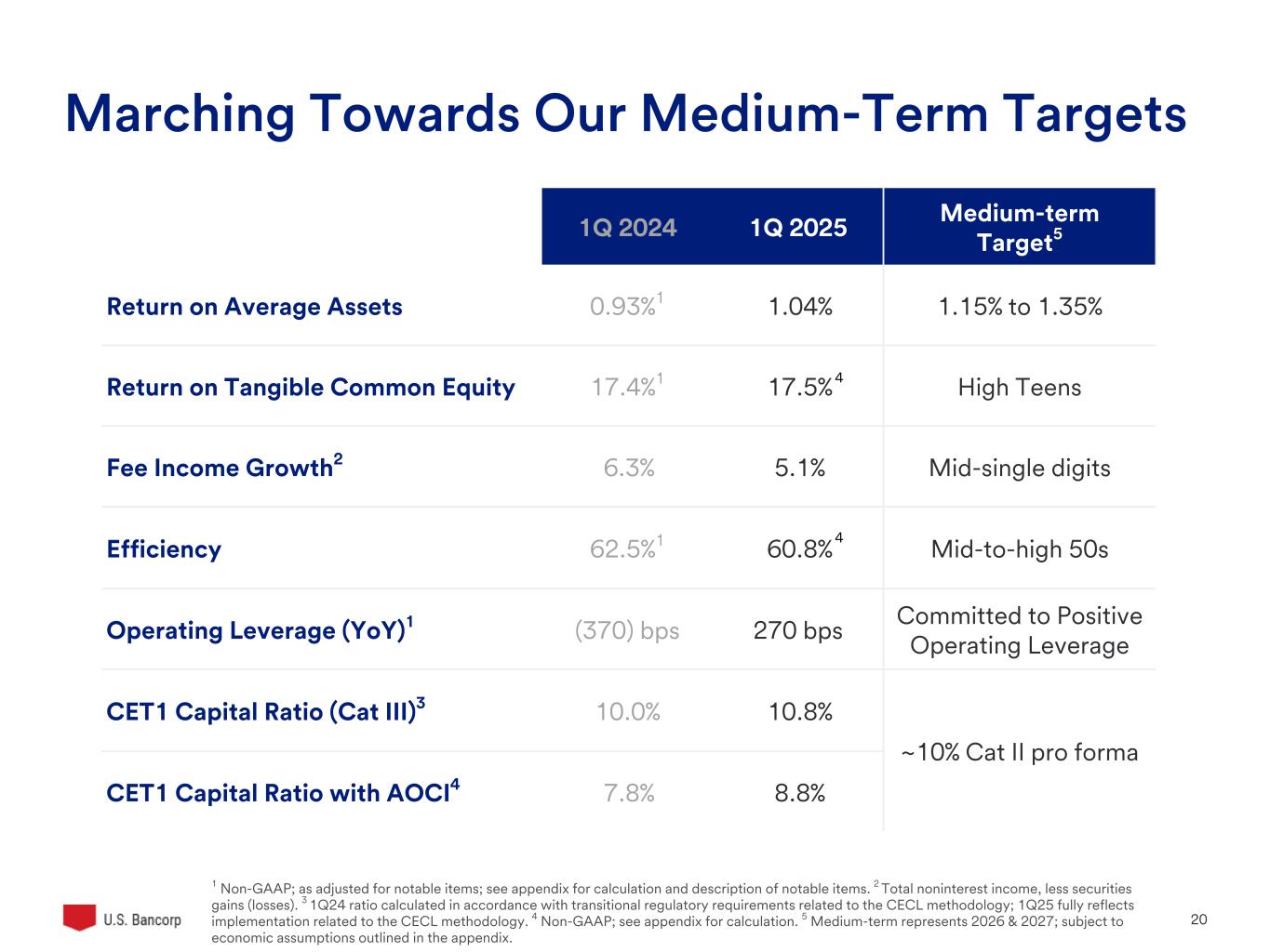 U.S. Bancorp 19 Guidance – 2Q and FY 2025 1Q25 Performance FY 2025 Guidance Net interest income1 Total noninterest expense Positive operating leverage3 1Q Guidance 1Q Result Relatively stable vs. Q4 2024 of $4,176M (excluding day count impact) $4,122M Relatively stable vs. Q4 2024 adjusted of $4,202M2 $4,232M 200+ bps 270 bps2 2Q25 Guidance Net interest income1 Total noninterest income Total noninterest expense $4.2B or Lower ~$2.9B $4.1B to $4.2B Positive operating leverage3 200+ bps Total net revenue +3% to 5% vs. FY 2024 of $27.6B1,4 Positive operating leverage3,5 200+ bps All guidance is on an adjusted basis 1 Taxable-equivalent basis; see appendix for calculation; 2 Non-GAAP; as adjusted for notable items; see appendix for calculations and descriptions of notable items; 3 As calculated on a year-over-year basis; 4 Non-GAAP; excludes $119M of securities losses taken in 3Q24 related to investment portfolio repositioning, see appendix for calculation; 5 Excluding the impact of securities gains or losses