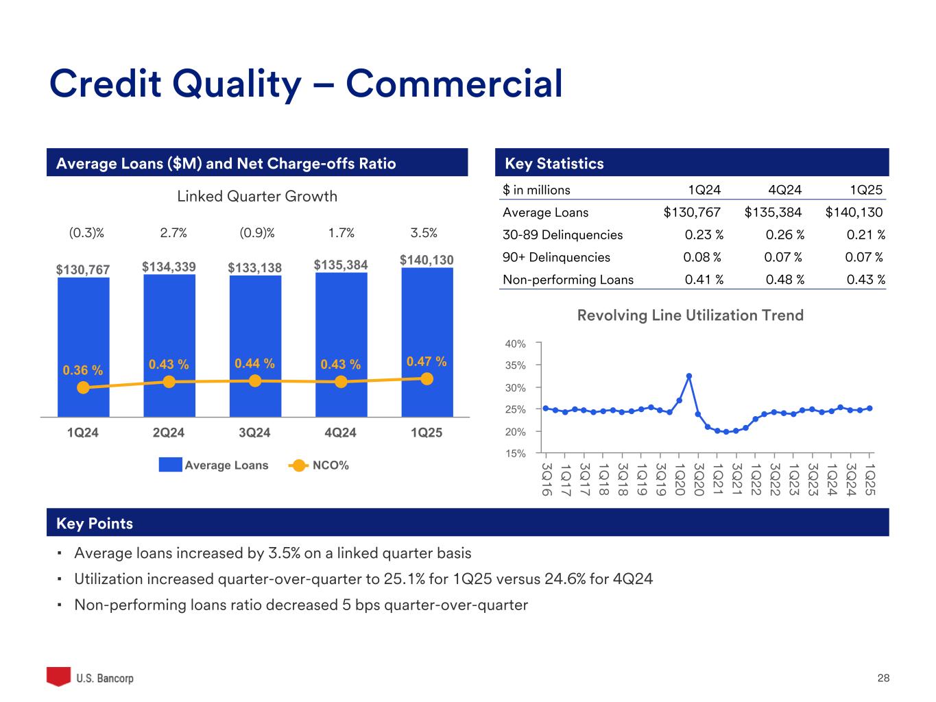 U.S. Bancorp 28 $130,767 $134,339 $133,138 $135,384 $140,130 0.36 % 0.43 % 0.44 % 0.43 % 0.47 % Average Loans NCO% 1Q24 2Q24 3Q24 4Q24 1Q25 Credit Quality – Commercial Key StatisticsAverage Loans ($M) and Net Charge-offs Ratio (0.3)% 2.7% (0.9)% 1.7% 3.5% Linked Quarter Growth Key Points ▪ Average loans increased by 3.5% on a linked quarter basis ▪ Utilization increased quarter-over-quarter to 25.1% for 1Q25 versus 24.6% for 4Q24 ▪ Non-performing loans ratio decreased 5 bps quarter-over-quarter $ in millions 1Q24 4Q24 1Q25 Average Loans $130,767 $135,384 $140,130 30-89 Delinquencies 0.23 % 0.26 % 0.21 % 90+ Delinquencies 0.08 % 0.07 % 0.07 % Non-performing Loans 0.41 % 0.48 % 0.43 % Revolving Line Utilization Trend 3Q 16 1Q 17 3Q 17 1Q 18 3Q 18 1Q 19 3Q 19 1Q 20 3Q 20 1Q 21 3Q 21 1Q 22 3Q 22 1Q 23 3Q 23 1Q 24 3Q 24 1Q 25 15% 20% 25% 30% 35% 40%
