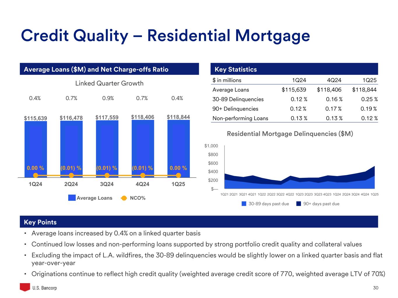 U.S. Bancorp 30 $115,639 $116,478 $117,559 $118,406 $118,844 0.00 % (0.01) % (0.01) % (0.01) % 0.00 % Average Loans NCO% 1Q24 2Q24 3Q24 4Q24 1Q25 Credit Quality – Residential Mortgage Key Points ▪ Average loans increased by 0.4% on a linked quarter basis ▪ Continued low losses and non-performing loans supported by strong portfolio credit quality and collateral values ▪ Excluding the impact of L.A. wildfires, the 30-89 delinquencies would be slightly lower on a linked quarter basis and flat year-over-year ▪ Originations continue to reflect high credit quality (weighted average credit score of 770, weighted average LTV of 70%) Linked Quarter Growth Average Loans ($M) and Net Charge-offs Ratio Key Statistics $ in millions 1Q24 4Q24 1Q25 Average Loans $115,639 $118,406 $118,844 30-89 Delinquencies 0.12 % 0.16 % 0.25 % 90+ Delinquencies 0.12 % 0.17 % 0.19 % Non-performing Loans 0.13 % 0.13 % 0.12 % 0.4% 0.7% 0.9% 0.7% 0.4% Residential Mortgage Delinquencies ($M) 30-89 days past due 90+ days past due 1Q21 2Q21 3Q21 4Q21 1Q22 2Q22 3Q22 4Q22 1Q23 2Q23 3Q23 4Q23 1Q24 2Q24 3Q24 4Q24 1Q25 $— $200 $400 $600 $800 $1,000