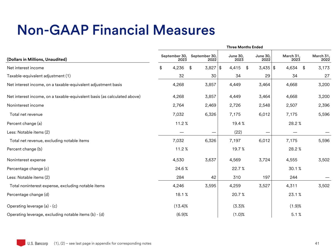 U.S. Bancorp 40 Non-GAAP Financial Measures Three Months Ended (Dollars in Millions, Unaudited) June 30, 2024 June 30, 2023 March 31, 2024 March 31, 2023 December 31, 2023 December 31, 2022 Net interest income $ 4,023 $ 4,415 $ 3,985 $ 4,634 $ 4,111 $ 4,293 Taxable-equivalent adjustment (1) 29 34 30 34 31 32 Net interest income, on a taxable-equivalent adjustment basis 4,052 4,449 4,015 4,668 4,142 4,325 Net interest income, on a taxable-equivalent basis (as calculated above) 4,052 4,449 4,015 4,668 4,142 4,325 Noninterest income 2,815 2,726 2,700 2,507 2,620 2,043 Total net revenue 6,867 7,175 6,715 7,175 6,762 6,368 Percent change (a) (4.3) % (6.4) % 6.2 % Less: Notable items (2) — (22) — — (118) (399) Total net revenue, excluding notable items 6,867 7,197 6,715 7,175 6,880 6,767 Percent change (b) (4.6) % (6.4) % 1.7 % Noninterest expense 4,214 4,569 4,459 4,555 5,219 4,043 Percentage change (c) (7.8) % (2.1) % 29.1 % Less: Notable items (2) 26 310 265 244 1,015 90 Total noninterest expense, excluding notable items 4,188 4,259 4,194 4,311 4,204 3,953 Percentage change (d) (1.7) % (2.7) % 6.4 % Operating leverage (a) - (c) 3.5 % (4.3) % (22.9) % Operating leverage, excluding notable items (b) - (d) (2.9) % (3.7) % (4.7) % (1), (2) – see last page in appendix for corresponding notes