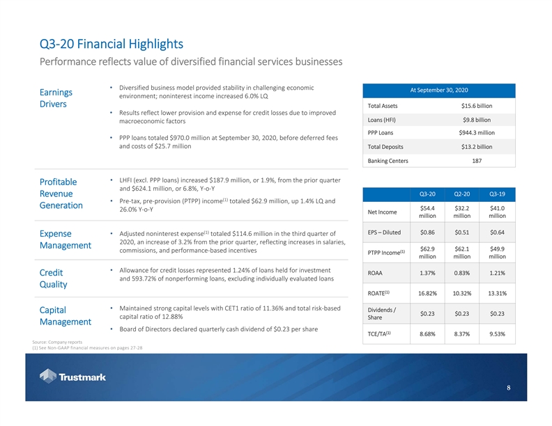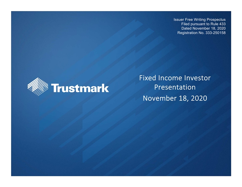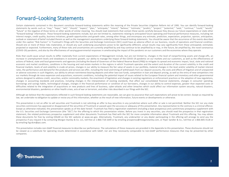 Forward–Looking Statements Certain statements contained in this document constitute forward‐looking statements within the meaning of the Private Securities Litigation Reform Act of 1995. You can identify forward‐looking statements by words such as “may,” “hope,” “will,” “should,” “expect,” “plan,” “anticipate,” “intend,” “believe,” “estimate,”“predict,”“project,” “potential,” “seek,” “continue,” “could,” “would,” “future” or the negative of those terms or other words of similar meaning. You should read statements that contain these words carefully because they discuss our future expectations or state other “forward‐looking” information. These forward‐looking statements include, but are not limited to, statements relating to anticipated future operating and financial performance measures, including net interest margin, credit quality, business initiatives, growth opportunities and growth rates, among other things, and encompass any estimate, prediction, expectation, projection, opinion, anticipation, outlook or statement of belief included therein as well as the management assumptions underlying these forward‐looking statements. You should be aware that the occurrence of the events described under the caption “Risk Factors” in Trustmark’s filings with the Securities and Exchange Commission (SEC) could have an adverse effect on our business, results of operations and financial condition. Should one or more of these risks materialize, or should any such underlying assumptions prove to be significantly different, actual results may vary significantly from those anticipated, estimated, projected or expected. Furthermore, many of these risks and uncertainties are currently amplified by and may continue to be amplified by or may, in the future, be amplified by, the novel coronavirus (COVID‐19) pandemic, and also by the effectiveness of varying governmental responses in ameliorating the impact of the pandemic on our customers and the economies where they operate. Risks that could cause actual results to differ materially from current expectations of Management include, but are not limited to, changes in the level of nonperforming assets and charge‐offs, an increase in unemployment levels and slowdowns in economic growth, our ability to manage the impact of the COVID‐19 pandemic on our markets and our customers, aswellasthe effectivenessof actions of federal, state and local governments and agencies (including the Board of Governors of the Federal Reserve Board (FRB)) to mitigate its spread and economic impact, local, state and national economic and market conditions, conditions in the housing and real estate markets in the regions in which Trustmark operates and the extent and duration of the current volatility in the credit and financial markets, levels of and volatility in crude oil prices, changes in our ability to measure the fair value of assets in our portfolio, material changes in the level and/or volatility of market interest rates, the performance and demand for the products and services we offer, including the level and timing of withdrawals from our deposit accounts, the costs and effects of litigation and of unexpected or adverse outcomes in such litigation, our ability to attract noninterest‐bearing deposits and other low‐cost funds, competition in loan and deposit pricing, as well as the entry of new competitors into our markets through de novo expansion and acquisitions, economic conditions, including the potential impact of issues related to the European financial system and monetary and other governmental actions designed to address credit, securities, and/or commodity markets, the enactment of legislation and changes in existing regulations or enforcement practices or the adoption of new regulations, changes in accounting standards and practices, including changes in the interpretation of existing standards, that affect our consolidated financial statements, changes in consumer spending, borrowings and savings habits, technological changes, changes in the financial performance or condition of our borrowers, changes in our ability to control expenses, greater than expected costs or difficulties related to the integration of acquisitions or new products and lines of business, cyber‐attacks and other breaches which could affect our information system security, natural disasters, environmental disasters, pandemics or other health crises, acts of war or terrorism, and other risks described in our filings with the SEC. Although we believe that the expectations reflected in such forward‐looking statements are reasonable, we can give no assurance that such expectations will prove to be correct. Except as required by law, we undertake no obligation to update or revise any of this information, whether as the result of new information, future events or developments orotherwise. This presentation is not an offer to sell securities and Trustmark is not soliciting an offer to buy securities in any jurisdiction where such offer or sale is not permitted. Neither the SEC nor any state securities commission has approved or disapproved of the securities of Trustmark or passed upon the accuracy or adequacy of this presentation. Any representation to the contrary is a criminal offence. Except as otherwise indicated, this presentation speaks as of the date hereof. Trustmark has filed a registration statement (including a base prospectus) and a preliminary prospectus supplement with the U.S. Securities and Exchange Commission (the “SEC”) for the offering to which this presentation relates. Before you invest in any securities, you should read the prospectus in that registration statement, the related preliminary prospectus supplement and other documents Trustmark has filed with the SEC for more complete information about Trustmark and this offering. You may obtain these documents for free by