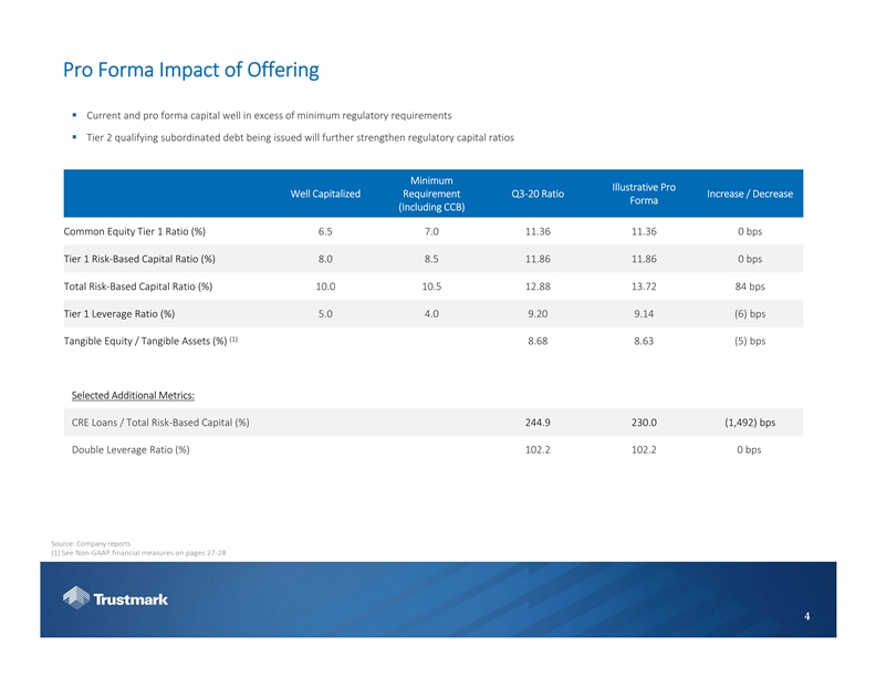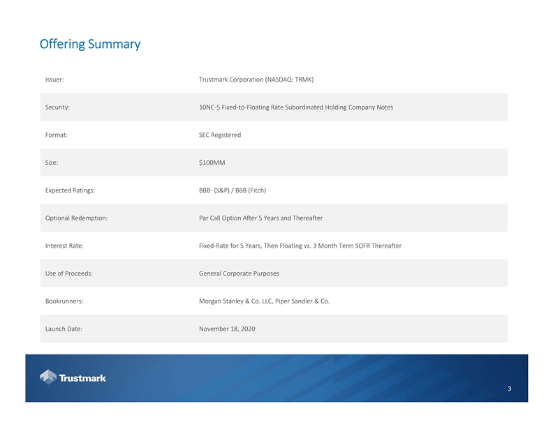 Offering Summary Issuer: Trustmark Corporation (NASDAQ: TRMK) Security: 10NC‐5 Fixed‐to‐Floating Rate Subordinated Holding Company Notes Format: SEC Registered Size: $100MM Expected Ratings: BBB‐ (S&P) / BBB (Fitch) Optional Redemption: Par Call Option After 5 Years and Thereafter Interest Rate: Fixed‐Rate for 5 Years, Then Floating vs. 3 Month Term SOFR Thereafter Use of Proceeds: General Corporate Purposes Bookrunners: Morgan Stanley & Co. LLC, Piper Sandler & Co. Launch Date: November 18, 2020 3Offering Summary Issuer: Trustmark Corporation (NASDAQ: TRMK) Security: 10NC‐5 Fixed‐to‐Floating Rate Subordinated Holding Company Notes Format: SEC Registered Size: $100MM Expected Ratings: BBB‐ (S&P) / BBB (Fitch) Optional Redemption: Par Call Option After 5 Years and Thereafter Interest Rate: Fixed‐Rate for 5 Years, Then Floating vs. 3 Month Term SOFR Thereafter Use of Proceeds: General Corporate Purposes Bookrunners: Morgan Stanley & Co. LLC, Piper Sandler & Co. Launch Date: November 18, 2020 3