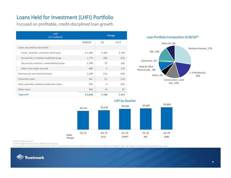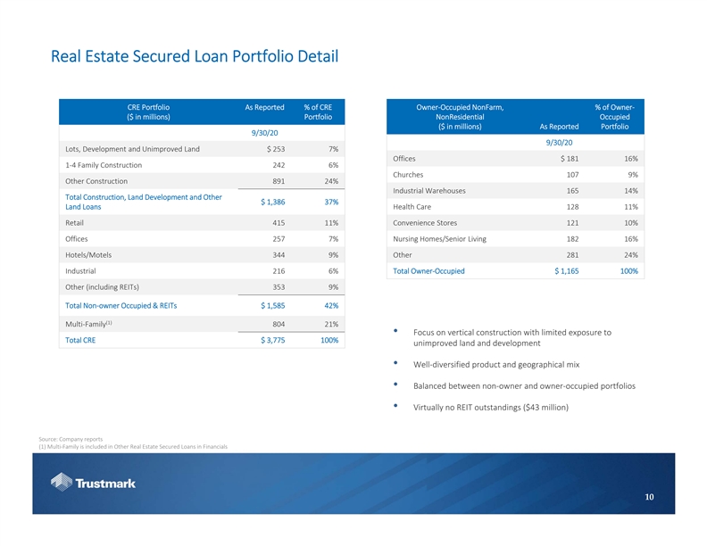 Loans Held for Investment (LHFI) Portfolio Focused on profitable, credit‐disciplined loan growth LHFI Change (1) ($ in millions) Loan Portfolio Composition 9/30/20 9/30/20 LQ Y‐o‐Y Other RE, 9% Loans secured by real estate: Nonfarm‐Nonres, 27% C&I, 14% Const., land dev. and other land loans $ 1,386 $ 109 $ 250 Secured by 1‐4 family residential prop. 1,775 (38) (45) Consumer, 2% Secured by nonfarm, nonresidential prop. 2,708 97 265 State & Other Other real estate secured 888 3 219 Political Sub. , 9% 1‐4 Residential, Commercial and industrial loans 1,398 (15) (93) Other, 6% 18% Consumer loans 161 (1) (16) Construction, Land Dev, 14% State and other political subdivision loans 935 4 (43) Other loans 596 29 87 Total LHFI $ 9,848 $ 188 $ 624 LHFI by Quarter $9,848 $9,660 $9,568 $9,336 $9,224 Q3‐19 Q4‐19 Q1‐20 Q2‐20 Q3‐20 Dollar (2) $112 $160 $92 $188 Change: Source: Company reports (1) Percentages may not sum to 100% due to rounding. (2) During Q1‐20, Trustmark reclassified $72.6 million of acquired loans to loans held for investment with the adoption of FASB ASC Topic 326. Reflects change excluding acquired loan reclass. 9Loans Held for Investment (LHFI) Portfolio Focused on profitable, credit‐disciplined loan growth LHFI Change (1) ($ in millions) Loan Portfolio Composition 9/30/20 9/30/20 LQ Y‐o‐Y Other RE, 9% Loans secured by real estate: Nonfarm‐Nonres, 27% C&I, 14% Const., land dev. and other land loans $ 1,386 $ 109 $ 250 Secured by 1‐4 family residential prop. 1,775 (38) (45) Consumer, 2% Secured by nonfarm, nonresidential prop. 2,708 97 265 State & Other Other real estate secured 888 3 219 Political Sub. , 9% 1‐4 Residential, Commercial and industrial loans 1,398 (15) (93) Other, 6% 18% Consumer loans 161 (1) (16) Construction, Land Dev, 14% State and other political subdivision loans 935 4 (43) Other loans 596 29 87 Total LHFI $ 9,848 $ 188 $ 624 LHFI by Quarter $9,848 $9,660 $9,568 $9,336 $9,224 Q3‐19 Q4‐19 Q1‐20 Q2‐20 Q3‐20 Dollar (2) $112 $160 $92 $188 Change: Source: Company reports (1) Percentages may not sum to 100% due to rounding. (2) During Q1‐20, Trustmark reclassified $72.6 million of acquired loans to loans held for investment with the adoption of FASB ASC Topic 326. Reflects change excluding acquired loan reclass. 9