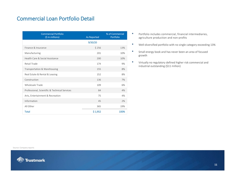 Real Estate Secured Loan Portfolio Detail CRE Portfolio As Reported % of CRE Owner‐Occupied NonFarm, % of Owner‐ ($ in millions) Portfolio NonResidential Occupied ($ in millions) As Reported Portfolio 9/30/20 9/30/20 Lots, Development and Unimproved Land $ 253 7% Offices $ 181 16% 1‐4 Family Construction 242 6% Churches 107 9% Other Construction 891 24% Industrial Warehouses 165 14% Total Construction, Land Development and Other $ 1,386 37% Land Loans Health Care 128 11% Retail 415 11% Convenience Stores 121 10% Offices 257 7% Nursing Homes/Senior Living 182 16% Hotels/Motels 344 9% Other 281 24% Industrial 216 6% Total Owner‐Occupied $ 1,165 100% Other (including REITs) 353 9% Total Non‐owner Occupied & REITs $ 1,585 42% (1) Multi‐Family 804 21% • Focus on vertical construction with limited exposure to Total CRE $ 3,775 100% unimproved land and development • Well‐diversified product and geographical mix • Balanced between non‐owner and owner‐occupied portfolios • Virtually no REIT outstandings ($43 million) Source: Company reports (1) Multi‐Family is included in Other Real Estate Secured Loans in Financials 10Real Estate Secured Loan Portfolio Detail CRE Portfolio As Reported % of CRE Owner‐Occupied NonFarm, % of Owner‐ ($ in millions) Portfolio NonResidential Occupied ($ in millions) As Reported Portfolio 9/30/20 9/30/20 Lots, Development and Unimproved Land $ 253 7% Offices $ 181 16% 1‐4 Family Construction 242 6% Churches 107 9% Other Construction 891 24% Industrial Warehouses 165 14% Total Construction, Land Development and Other $ 1,386 37% Land Loans Health Care 128 11% Retail 415 11% Convenience Stores 121 10% Offices 257 7% Nursing Homes/Senior Living 182 16% Hotels/Motels 344 9% Other 281 24% Industrial 216 6% Total Owner‐Occupied $ 1,165 100% Other (including REITs) 353 9% Total Non‐owner Occupied & REITs $ 1,585 42% (1) Multi‐Family 804 21% • Focus on vertical construction with limited exposure to Total CRE $ 3,775 100% unimproved land and development • Well‐diversified product and geographical mix • Balanced between non‐owner and owner‐occupied portfolios • Virtually no REIT outstandings ($43 million) Source: Company reports (1) Multi‐Family is included in Other Real Estate Secured Loans in Financials 10