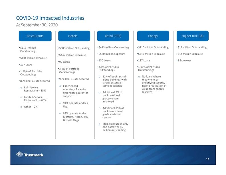 Commercial Loan Portfolio Detail Commercial Portfolio % of Commercial • Portfolio includes commercial, financial intermediaries, ($ in millions) As Reported Portfolio agriculture production and non‐profits 9/30/20 • Well‐diversified portfolio with no single category exceeding 13% Finance & Insurance $ 256 13% • Small energy book and has never been an area of focused Manufacturing 201 10% growth Health Care & Social Assistance 200 10% • Virtually no regulatory defined higher risk commercial and Retail Trade 174 9% industrial outstanding ($11 million) Transportation & Warehousing 155 8% Real Estate & Rental & Leasing 152 8% Construction 136 7% Wholesale Trade 109 6% Professional, Scientific & Technical Services 84 4% Arts, Entertainment & Recreation 75 4% Information 45 2% All Other 365 19% Total $ 1,952 100% Source: Company reports 11Commercial Loan Portfolio Detail Commercial Portfolio % of Commercial • Portfolio includes commercial, financial intermediaries, ($ in millions) As Reported Portfolio agriculture production and non‐profits 9/30/20 • Well‐diversified portfolio with no single category exceeding 13% Finance & Insurance $ 256 13% • Small energy book and has never been an area of focused Manufacturing 201 10% growth Health Care & Social Assistance 200 10% • Virtually no regulatory defined higher risk commercial and Retail Trade 174 9% industrial outstanding ($11 million) Transportation & Warehousing 155 8% Real Estate & Rental & Leasing 152 8% Construction 136 7% Wholesale Trade 109 6% Professional, Scientific & Technical Services 84 4% Arts, Entertainment & Recreation 75 4% Information 45 2% All Other 365 19% Total $ 1,952 100% Source: Company reports 11