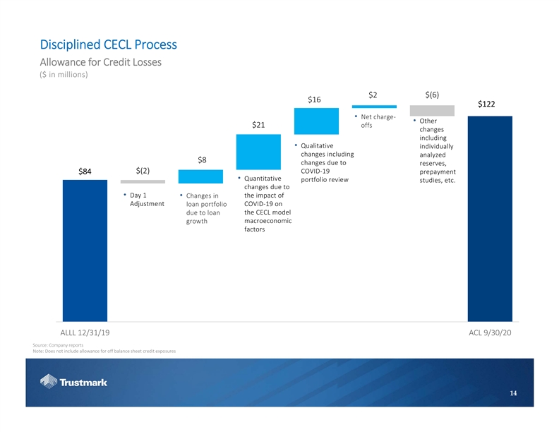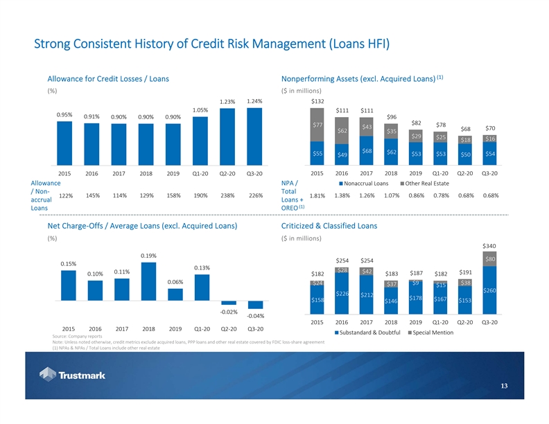 Strong Consistent History of Credit Risk Management (Loans HFI) (1) Allowance for Credit Losses / Loans Nonperforming Assets (excl. Acquired Loans) (%) ($ in millions) 1.24% $132 1.23% 1.05% $111 $111 0.95% 0.91% 0.90% 0.90% 0.90% $96 $82 $77 $78 $43 $70 $68 $62 $35 $29 $25 $16 $18 $68 $62 $55 $53 $53 $54 $49 $50 2015 2016 2017 2018 2019 Q1‐20 Q2‐20 Q3‐20 2015 2016 2017 2018 2019 Q1‐20 Q2‐20 Q3‐20 Allowance NPA / Nonaccrual Loans Other Real Estate / Non‐ Total 122% 145% 114% 129% 158% 190% 238% 226% 1.81% 1.38% 1.26% 1.07% 0.86% 0.78% 0.68% 0.68% accrual Loans + (1) Loans OREO Net Charge‐Offs / Average Loans (excl. Acquired Loans) Criticized & Classified Loans (%) ($ in millions) $340 0.19% $80 $254 $254 0.15% 0.13% $28 0.11% $42 $191 $187 0.10% $182 $183 $182 0.06% $9 $38 $24 $37 $15 $260 $226 $212 $178 $167 $158 $146 $153 ‐0.02% ‐0.04% 2015 2016 2017 2018 2019 Q1‐20 Q2‐20 Q3‐20 2015 2016 2017 2018 2019 Q1‐20 Q2‐20 Q3‐20 Substandard & Doubtful Special Mention Source: Company reports Note: Unless noted otherwise, credit metrics exclude acquired loans, PPP loans and other real estate covered by FDIC loss‐share agreement (1) NPAs & NPAs / Total Loans include other real estate 13Strong Consistent History of Credit Risk Management (Loans HFI) (1) Allowance for Credit Losses / Loans Nonperforming Assets (excl. Acquired Loans) (%) ($ in millions) 1.24% $132 1.23% 1.05% $111 $111 0.95% 0.91% 0.90% 0.90% 0.90% $96 $82 $77 $78 $43 $70 $68 $62 $35 $29 $25 $16 $18 $68 $62 $55 $53 $53 $54 $49 $50 2015 2016 2017 2018 2019 Q1‐20 Q2‐20 Q3‐20 2015 2016 2017 2018 2019 Q1‐20 Q2‐20 Q3‐20 Allowance NPA / Nonaccrual Loans Other Real Estate / Non‐ Total 122% 145% 114% 129% 158% 190% 238% 226% 1.81% 1.38% 1.26% 1.07% 0.86% 0.78% 0.68% 0.68% accrual Loans + (1) Loans OREO Net Charge‐Offs / Average Loans (excl. Acquired Loans) Criticized & Classified Loans (%) ($ in millions) $340 0.19% $80 $254 $254 0.15% 0.13% $28 0.11% $42 $191 $187 0.10% $182 $183 $182 0.06% $9 $38 $24 $37 $15 $260 $226 $212 $178 $167 $158 $146 $153 ‐0.02% ‐0.04% 2015 2016 2017 2018 2019 Q1‐20 Q2‐20 Q3‐20 2015 2016 2017 2018 2019 Q1‐20 Q2‐20 Q3‐20 Substandard & Doubtful Special Mention Source: Company reports Note: Unless noted otherwise, credit metrics exclude acquired loans, PPP loans and other real estate covered by FDIC loss‐share agreement (1) NPAs & NPAs / Total Loans include other real estate 13