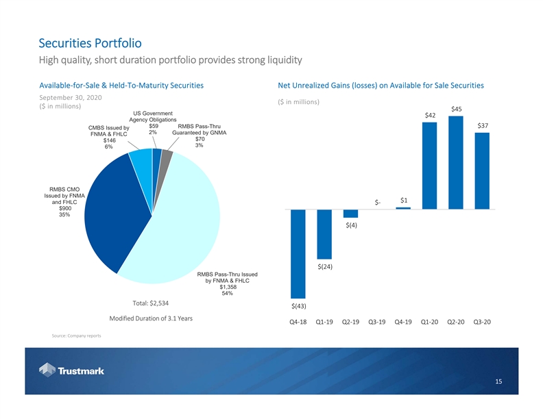 Disciplined CECL Process Allowance for Credit Losses ($ in millions) $2 $(6) $16 $122 • Net charge‐ • Other $21 offs changes including • Qualitative individually changes including analyzed $8 changes due to reserves, $(2) COVID‐19 prepayment $84 • Quantitative portfolio review studies, etc. changes due to • Day 1 • Changes in the impact of Adjustment loan portfolio COVID‐19 on due to loan the CECL model growth macroeconomic factors ALLL 12/31/19 ACL 9/30/20 Source: Company reports Note: Does not include allowance for off balance sheet credit exposures 14Disciplined CECL Process Allowance for Credit Losses ($ in millions) $2 $(6) $16 $122 • Net charge‐ • Other $21 offs changes including • Qualitative individually changes including analyzed $8 changes due to reserves, $(2) COVID‐19 prepayment $84 • Quantitative portfolio review studies, etc. changes due to • Day 1 • Changes in the impact of Adjustment loan portfolio COVID‐19 on due to loan the CECL model growth macroeconomic factors ALLL 12/31/19 ACL 9/30/20 Source: Company reports Note: Does not include allowance for off balance sheet credit exposures 14