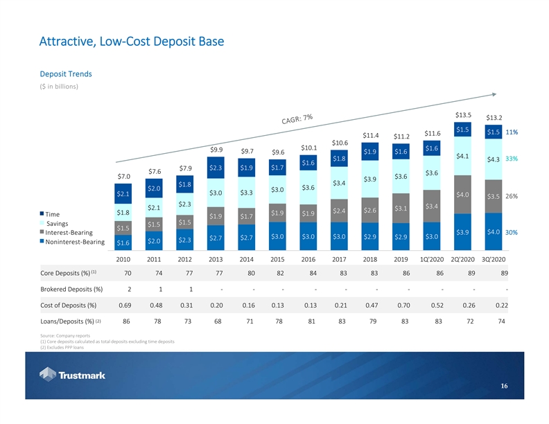 Securities Portfolio High quality, short duration portfolio provides strong liquidity Available‐for‐Sale & Held‐To‐Maturity Securities Net Unrealized Gains (losses) on Available for Sale Securities September 30, 2020 ($ in millions) ($ in millions) $45 US Government $42 Agency Obligations $59 RMBS Pass-Thru $37 CMBS Issued by 2% Guaranteed by GNMA FNMA & FHLC $70 $146 3% 6% RMBS CMO Issued by FNMA $1 and FHLC $‐ $900 35% $(4) $(24) RMBS Pass-Thru Issued by FNMA & FHLC $1,358 54% Total: $2,534 $(43) Modified Duration of 3.1 Years Q4‐18 Q1‐19 Q2‐19 Q3‐19 Q4‐19 Q1‐20 Q2‐20 Q3‐20 Source: Company reports 15Securities Portfolio High quality, short duration portfolio provides strong liquidity Available‐for‐Sale & Held‐To‐Maturity Securities Net Unrealized Gains (losses) on Available for Sale Securities September 30, 2020 ($ in millions) ($ in millions) $45 US Government $42 Agency Obligations $59 RMBS Pass-Thru $37 CMBS Issued by 2% Guaranteed by GNMA FNMA & FHLC $70 $146 3% 6% RMBS CMO Issued by FNMA $1 and FHLC $‐ $900 35% $(4) $(24) RMBS Pass-Thru Issued by FNMA & FHLC $1,358 54% Total: $2,534 $(43) Modified Duration of 3.1 Years Q4‐18 Q1‐19 Q2‐19 Q3‐19 Q4‐19 Q1‐20 Q2‐20 Q3‐20 Source: Company reports 15