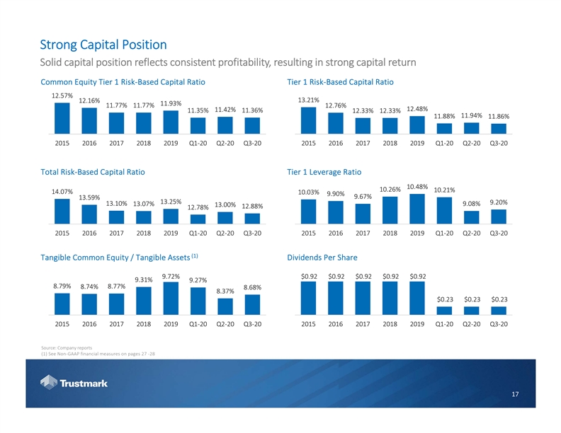 Attractive, Low‐Cost Deposit Base Deposit Trends ($ in billions) $13.5 $13.2 $1.5 $1.5 11% $11.6 $11.4 $11.2 $10.6 $10.1 $1.6 $9.9 $9.7 $1.9 $1.6 $9.6 $4.1 $1.8 33% $4.3 $1.6 $2.3 $1.9 $1.7 $7.9 $7.6 $3.6 $7.0 $3.6 $3.9 $3.4 $1.8 $3.6 $2.0 $3.0 $3.3 $3.0 $2.1 $4.0 26% $3.5 $2.3 $3.4 $2.1 $3.1 $2.6 $2.4 $1.8 $1.9 $1.9 Time $1.9 $1.7 $1.5 Savings $1.5 $1.5 $4.0 Interest‐Bearing $3.9 30% $3.0 $3.0 $3.0 $2.9 $2.9 $3.0 $2.7 $2.7 $2.3 $2.0 Noninterest‐Bearing $1.6 2010 2011 2012 2013 2014 2015 2016 2017 2018 2019 1Q'2020 2Q'2020 3Q'2020 (1) Core Deposits (%) 70 74 77 77 80 82 84 83 83 86 86 89 89 Brokered Deposits (%) 2 1 1 ‐ ‐ ‐ ‐ ‐ ‐ ‐ ‐ ‐ ‐ Cost of Deposits (%) 0.69 0.48 0.31 0.20 0.16 0.13 0.13 0.21 0.47 0.70 0.52 0.26 0.22 (2) Loans/Deposits (%) 86 78 73 68 71 78 81 83 79 83 83 72 74 Source: Company reports (1) Core deposits calculated as total deposits excluding time deposits (2) Excludes PPP loans 16Attractive, Low‐Cost Deposit Base Deposit Trends ($ in billions) $13.5 $13.2 $1.5 $1.5 11% $11.6 $11.4 $11.2 $10.6 $10.1 $1.6 $9.9 $9.7 $1.9 $1.6 $9.6 $4.1 $1.8 33% $4.3 $1.6 $2.3 $1.9 $1.7 $7.9 $7.6 $3.6 $7.0 $3.6 $3.9 $3.4 $1.8 $3.6 $2.0 $3.0 $3.3 $3.0 $2.1 $4.0 26% $3.5 $2.3 $3.4 $2.1 $3.1 $2.6 $2.4 $1.8 $1.9 $1.9 Time $1.9 $1.7 $1.5 Savings $1.5 $1.5 $4.0 Interest‐Bearing $3.9 30% $3.0 $3.0 $3.0 $2.9 $2.9 $3.0 $2.7 $2.7 $2.3 $2.0 Noninterest‐Bearing $1.6 2010 2011 2012 2013 2014 2015 2016 2017 2018 2019 1Q'2020 2Q'2020 3Q'2020 (1) Core Deposits (%) 70 74 77 77 80 82 84 83 83 86 86 89 89 Brokered Deposits (%) 2 1 1 ‐ ‐ ‐ ‐ ‐ ‐ ‐ ‐ ‐ ‐ Cost of Deposits (%) 0.69 0.48 0.31 0.20 0.16 0.13 0.13 0.21 0.47 0.70 0.52 0.26 0.22 (2) Loans/Deposits (%) 86 78 73 68 71 78 81 83 79 83 83 72 74 Source: Company reports (1) Core deposits calculated as total deposits excluding time deposits (2) Excludes PPP loans 16