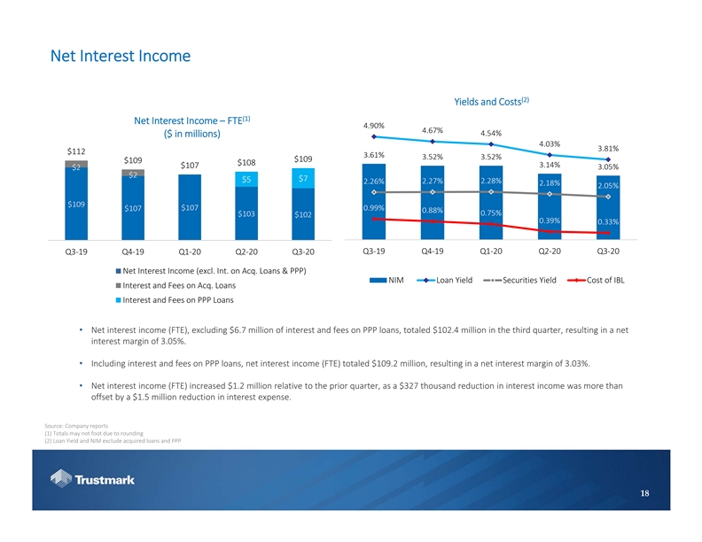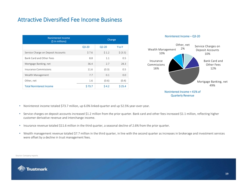 Net Interest Income (2) Yields and Costs (1) Net Interest Income – FTE 4.90% 4.67% 4.54% ($ in millions) 4.03% 3.81% $112 3.61% 3.52% 3.52% $109 $109 $108 3.14% $107 3.05% $2 $2 $7 $5 2.27% 2.28% 2.26% 2.18% 2.05% $109 $107 $107 0.99% 0.88% 0.75% $103 $102 0.39% 0.33% Q3‐19 Q4‐19 Q1‐20 Q2‐20 Q3‐20 Q3‐19 Q4‐19 Q1‐20 Q2‐20 Q3‐20 Net Interest Income (excl. Int. on Acq. Loans & PPP) NIM Loan Yield Securities Yield Cost of IBL Interest and Fees on Acq. Loans Interest and Fees on PPP Loans • Net interest income (FTE), excluding $6.7 million of interest and fees on PPP loans, totaled $102.4 million in the third quarter, resulting in a net interest margin of 3.05%. • Including interest and fees on PPP loans, net interest income (FTE) totaled $109.2 million, resulting in a net interest margin of 3.03%. • Net interest income (FTE) increased $1.2 million relative to the prior quarter, as a $327 thousand reduction in interest income was more than offset by a $1.5 million reduction in interest expense. Source: Company reports (1) Totals may not foot due to rounding (2) Loan Yield and NIM exclude acquired loans and PPP 18Net Interest Income (2) Yields and Costs (1) Net Interest Income – FTE 4.90% 4.67% 4.54% ($ in millions) 4.03% 3.81% $112 3.61% 3.52% 3.52% $109 $109 $108 3.14% $107 3.05% $2 $2 $7 $5 2.27% 2.28% 2.26% 2.18% 2.05% $109 $107 $107 0.99% 0.88% 0.75% $103 $102 0.39% 0.33% Q3‐19 Q4‐19 Q1‐20 Q2‐20 Q3‐20 Q3‐19 Q4‐19 Q1‐20 Q2‐20 Q3‐20 Net Interest Income (excl. Int. on Acq. Loans & PPP) NIM Loan Yield Securities Yield Cost of IBL Interest and Fees on Acq. Loans Interest and Fees on PPP Loans • Net interest income (FTE), excluding $6.7 million of interest and fees on PPP loans, totaled $102.4 million in the third quarter, resulting in a net interest margin of 3.05%. • Including interest and fees on PPP loans, net interest income (FTE) totaled $109.2 million, resulting in a net interest margin of 3.03%. • Net interest income (FTE) increased $1.2 million relative to the prior quarter, as a $327 thousand reduction in interest income was more than offset by a $1.5 million reduction in interest expense. Source: Company reports (1) Totals may not foot due to rounding (2) Loan Yield and NIM exclude acquired loans and PPP 18