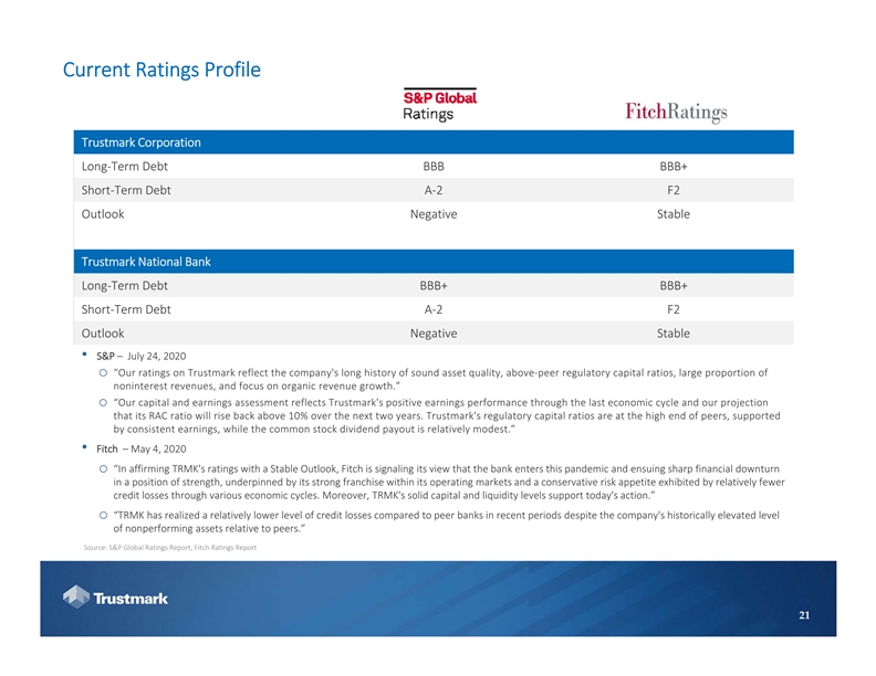 Current Ratings Profile Trustmark Corporation Long‐Term Debt BBB BBB+ Short‐Term Debt A‐2 F2 Outlook Negative Stable Trustmark National Bank Long‐Term Debt BBB+ BBB+ Short‐Term Debt A‐2 F2 Outlook Negative Stable • S&P – July 24, 2020 o “Our ratings on Trustmark reflect the company's long history of sound asset quality, above‐peer regulatory capital ratios, large proportion of noninterest revenues, and focus on organic revenue growth.” o “Our capital and earnings assessment reflects Trustmark's positive earnings performance through the last economic cycle and our projection that its RAC ratio will rise back above 10% over the next two years. Trustmark's regulatory capital ratios are at the high end of peers, supported by consistent earnings, while the common stock dividend payout is relatively modest.” • Fitch – May 4, 2020 o “In affirming TRMK's ratings with a Stable Outlook, Fitch is signaling its view that the bank enters this pandemic and ensuing sharp financial downturn in a position of strength, underpinned by its strong franchise within its operating markets and a conservative risk appetite exhibited by relatively fewer credit losses through various economic cycles. Moreover, TRMK's solid capital and liquidity levels support today's action.” o “TRMK has realized a relatively lower level of credit losses compared to peer banks in recent periods despite the company's historically elevated level of nonperforming assets relative to peers.” Source: S&P Global Ratings Report, Fitch Ratings Report 21Current Ratings Profile Trustmark Corporation Long‐Term Debt BBB BBB+ Short‐Term Debt A‐2 F2 Outlook Negative Stable Trustmark National Bank Long‐Term Debt BBB+ BBB+ Short‐Term Debt A‐2 F2 Outlook Negative Stable • S&P – July 24, 2020 o “Our ratings on Trustmark reflect the company's long history of sound asset quality, above‐peer regulatory capital ratios, large proportion of noninterest revenues, and focus on organic revenue growth.” o “Our capital and earnings assessment reflects Trustmark's positive earnings performance through the last economic cycle and our projection that its RAC ratio will rise back above 10% over the next two years. Trustmark's regulatory capital ratios are at the high end of peers, supported by consistent earnings, while the common stock dividend payout is relatively modest.” • Fitch – May 4, 2020 o “In affirming TRMK's ratings with a Stable Outlook, Fitch is signaling its view that the bank enters this pandemic and ensuing sharp financial downturn in a position of strength, underpinned by its strong franchise within its operating markets and a conservative risk appetite exhibited by relatively fewer credit losses through various economic cycles. Moreover, TRMK's solid capital and liquidity levels support today's action.” o “TRMK has realized a relatively lower level of credit losses compared to peer banks in recent periods despite the company's historically elevated level of nonperforming assets relative to peers.” Source: S&P Global Ratings Report, Fitch Ratings Report 21