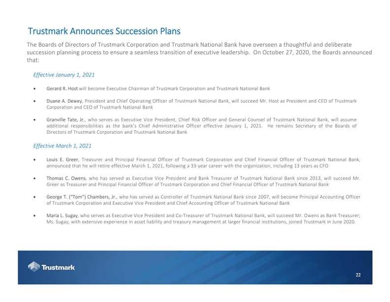 Trustmark Announces Succession Plans The Boards of Directors of Trustmark Corporation and Trustmark National Bank have overseen a thoughtful and deliberate succession planning process to ensure a seamless transition of executive leadership. On October 27, 2020, the Boards announced that: Effective January 1, 2021 · Gerard R. Host will become Executive Chairman of Trustmark Corporation and Trustmark National Bank · Duane A. Dewey, President and Chief Operating Officer of Trustmark National Bank, will succeed Mr. Host as President and CEO of Trustmark Corporation and CEO of Trustmark National Bank · Granville Tate, Jr., who serves as Executive Vice President, Chief Risk Officer and General Counsel of Trustmark National Bank, will assume additional responsibilities as the bank’s Chief Administrative Officer effective January 1, 2021. He remains Secretary of the Boards of Directors of Trustmark Corporation and Trustmark National Bank Effective March 1, 2021 · Louis E. Greer, Treasurer and Principal Financial Officer of Trustmark Corporation and Chief Financial Officer of Trustmark National Bank, announced that he will retire effective March 1, 2021, following a 33‐year career with the organization, including 13 years as CFO · Thomas C. Owens, who has served as Executive Vice President and Bank Treasurer of Trustmark National Bank since 2013, will succeed Mr. Greer as Treasurer and Principal Financial Officer of Trustmark Corporation and Chief Financial Officer of Trustmark National Bank · George T. (“Tom”) Chambers, Jr., who has served as Controller of Trustmark National Bank since 2007, will become Principal Accounting Officer of Trustmark Corporation and Executive Vice President and Chief Accounting Officer of Trustmark National Bank · Maria L. Sugay, who serves as Executive Vice President and Co‐Treasurer of Trustmark National Bank, will succeed Mr. Owens as Bank Treasurer; Ms. Sugay, with extensive experience in asset liability and treasury management at larger financial institutions, joined Trustmark in June 2020. 22Trustmark Announces Succession Plans The Boards of Directors of Trustmark Corporation and Trustmark National Bank have overseen a thoughtful and deliberate succession planning process to ensure a seamless transition of executive leadership. On October 27, 2020, the Boards announced that: Effective January 1, 2021 · Gerard R. Host will become Executive Chairman of Trustmark Corporation and Trustmark National Bank · Duane A. Dewey, President and Chief Operating Officer of Trustmark National Bank, will succeed Mr. Host as President and CEO of Trustmark Corporation and CEO of Trustmark National Bank · Granville Tate, Jr., who serves as Executive Vice President, Chief Risk Officer and General Counsel of Trustmark National Bank, will assume additional responsibilities as the bank’s Chief Administrative Officer effective January 1, 2021. He remains Secretary of the Boards of Directors of Trustmark Corporation and Trustmark National Bank Effective March 1, 2021 · Louis E. Greer, Treasurer and Principal Financial Officer of Trustmark Corporation and Chief Financial Officer of Trustmark National Bank, announced that he will retire effective March 1, 2021, following a 33‐year career with the organization, including 13 years as CFO · Thomas C. Owens, who has served as Executive Vice President and Bank Treasurer of Trustmark National Bank since 2013, will succeed Mr. Greer as Treasurer and Principal Financial Officer of Trustmark Corporation and Chief Financial Officer of Trustmark National Bank · George T. (“Tom”) Chambers, Jr., who has served as Controller of Trustmark National Bank since 2007, will become Principal Accounting Officer of Trustmark Corporation and Executive Vice President and Chief Accounting Officer of Trustmark National Bank · Maria L. Sugay, who serves as Executive Vice President and Co‐Treasurer of Trustmark National Bank, will succeed Mr. Owens as Bank Treasurer; Ms. Sugay, with extensive experience in asset liability and treasury management at larger financial institutions, joined Trustmark in June 2020. 22