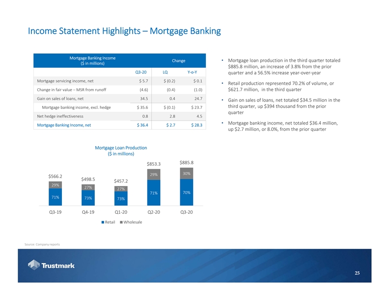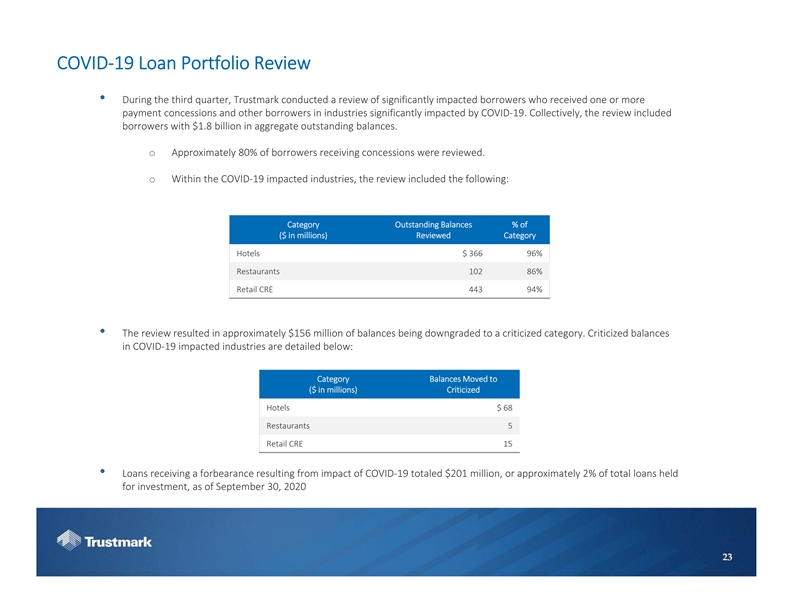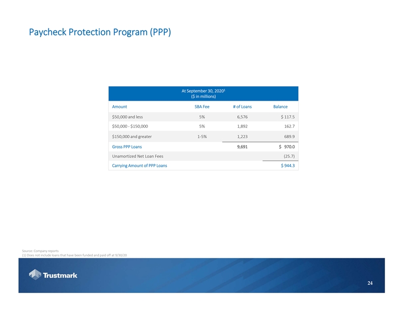 COVID‐19 Loan Portfolio Review • During the third quarter, Trustmark conducted a review of significantly impacted borrowers who received one or more payment concessions and other borrowers in industries significantly impacted by COVID‐19. Collectively, the review included borrowers with $1.8 billion in aggregate outstanding balances. o Approximately 80% of borrowers receiving concessions were reviewed. o Within the COVID‐19 impacted industries, the review included the following: Category Outstanding Balances % of ($ in millions) Reviewed Category Hotels $ 366 96% Restaurants 102 86% Retail CRE 443 94% • The review resulted in approximately $156 million of balances being downgraded to a criticized category. Criticized balances in COVID‐19 impacted industries are detailed below: Category Balances Moved to ($ in millions) Criticized Hotels $ 68 Restaurants 5 Retail CRE 15 • Loans receiving a forbearance resulting from impact of COVID‐19 totaled $201 million, or approximately 2% of total loans held for investment, as of September 30, 2020 23COVID‐19 Loan Portfolio Review • During the third quarter, Trustmark conducted a review of significantly impacted borrowers who received one or more payment concessions and other borrowers in industries significantly impacted by COVID‐19. Collectively, the review included borrowers with $1.8 billion in aggregate outstanding balances. o Approximately 80% of borrowers receiving concessions were reviewed. o Within the COVID‐19 impacted industries, the review included the following: Category Outstanding Balances % of ($ in millions) Reviewed Category Hotels $ 366 96% Restaurants 102 86% Retail CRE 443 94% • The review resulted in approximately $156 million of balances being downgraded to a criticized category. Criticized balances in COVID‐19 impacted industries are detailed below: Category Balances Moved to ($ in millions) Criticized Hotels $ 68 Restaurants 5 Retail CRE 15 • Loans receiving a forbearance resulting from impact of COVID‐19 totaled $201 million, or approximately 2% of total loans held for investment, as of September 30, 2020 23